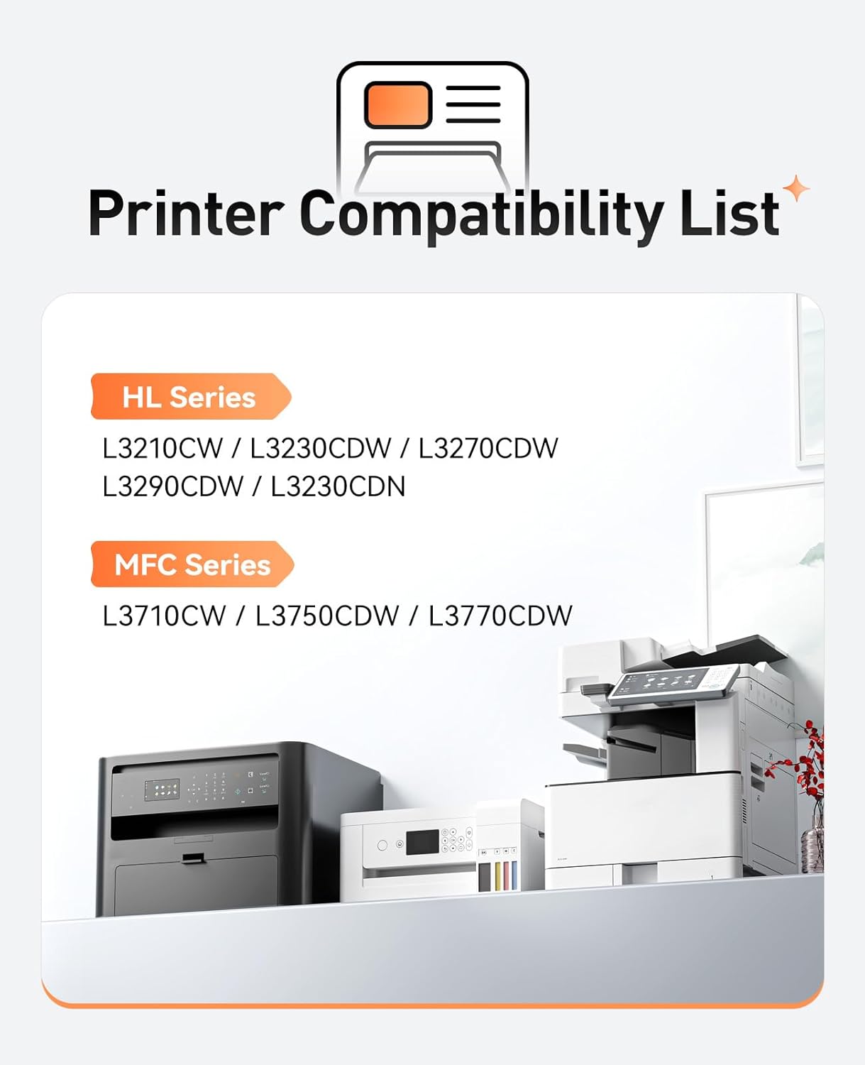 • Compatible Devices : Compatible with Brother HL Series Printer:HL-L3210CW HL-L3230CDW HL-L3270CDW HL-L3290CDW HL-L3230CDN; Compatible with Brother MFC Series Printer:MFC-L3710CW MFC-L3750CDW MFC-L3770CDW. Compatible with Brother HL Series Printer:HL-L3210CW HL-L3230CDW HL-L3270CDW HL-L3290CDW HL-L3230CDN; Compatible with Brother MFC Series Printer:MFC-L3710CW MFC-L3750CDW MFC-L3770CDW.