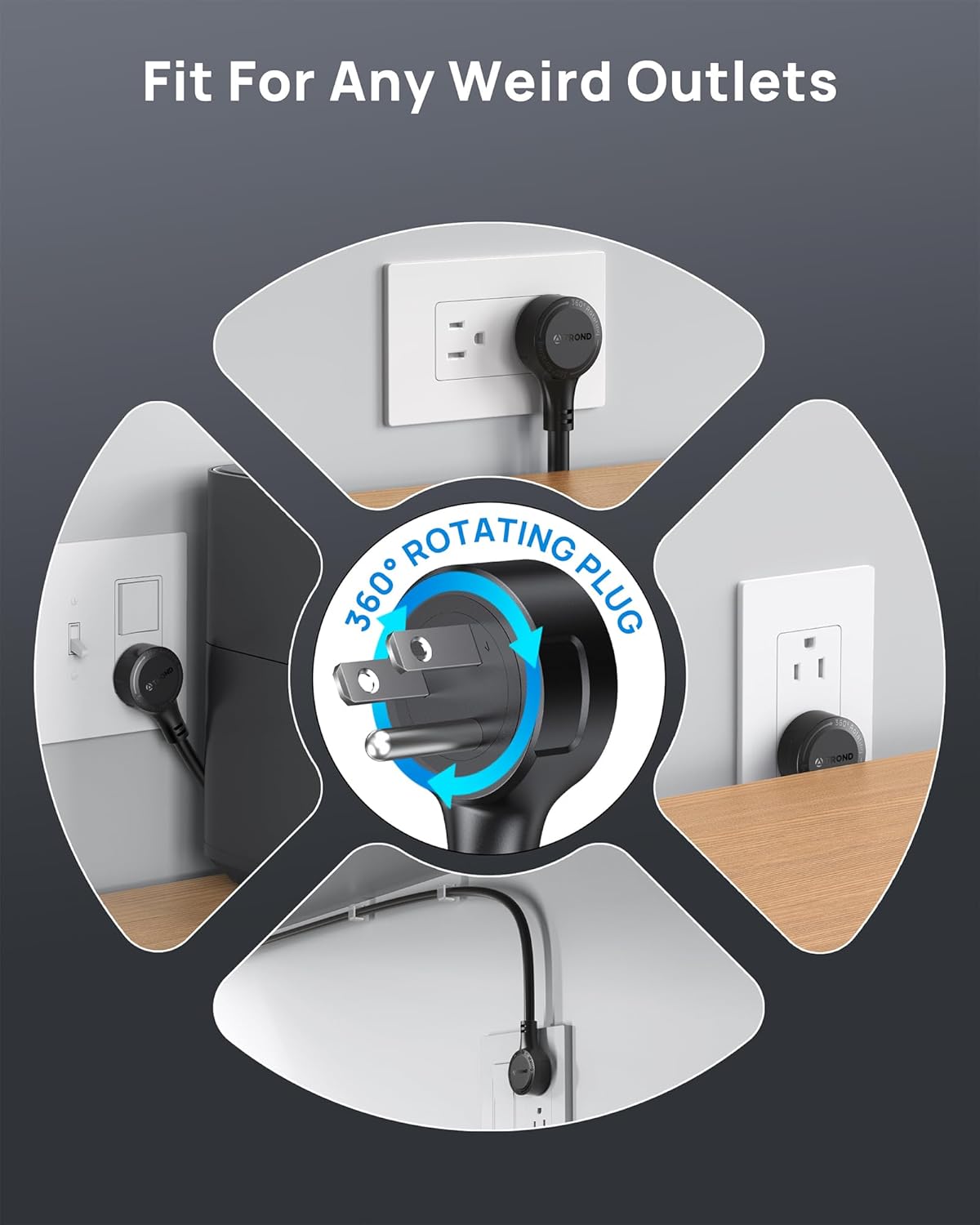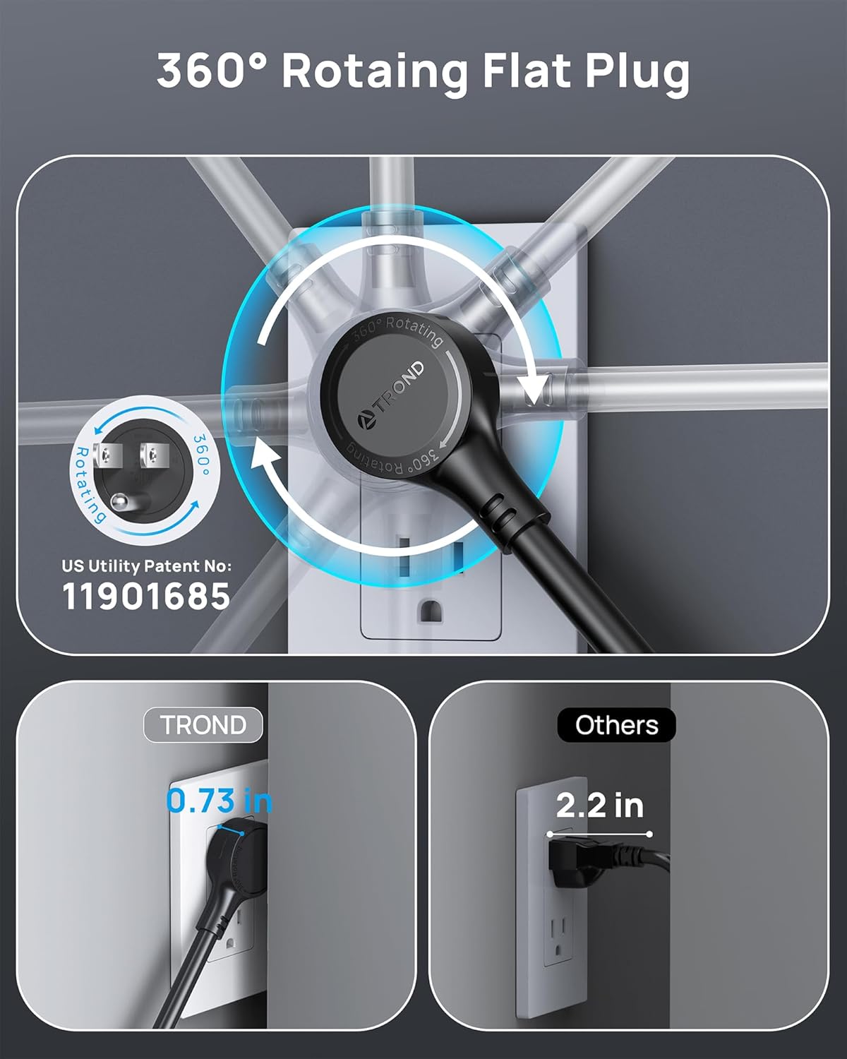 • 360° Rotating Flat Plug: 360° rotating flat plug design can fit any plug and be inserted perfectly at any angle(0.73 in thickness). Handy to use in confined areas. US Utility Patent No. 11901685. Made of 14AWG pure copper, the 5-foot extension cord is heavy-duty and has better current carrying capacity (15a).