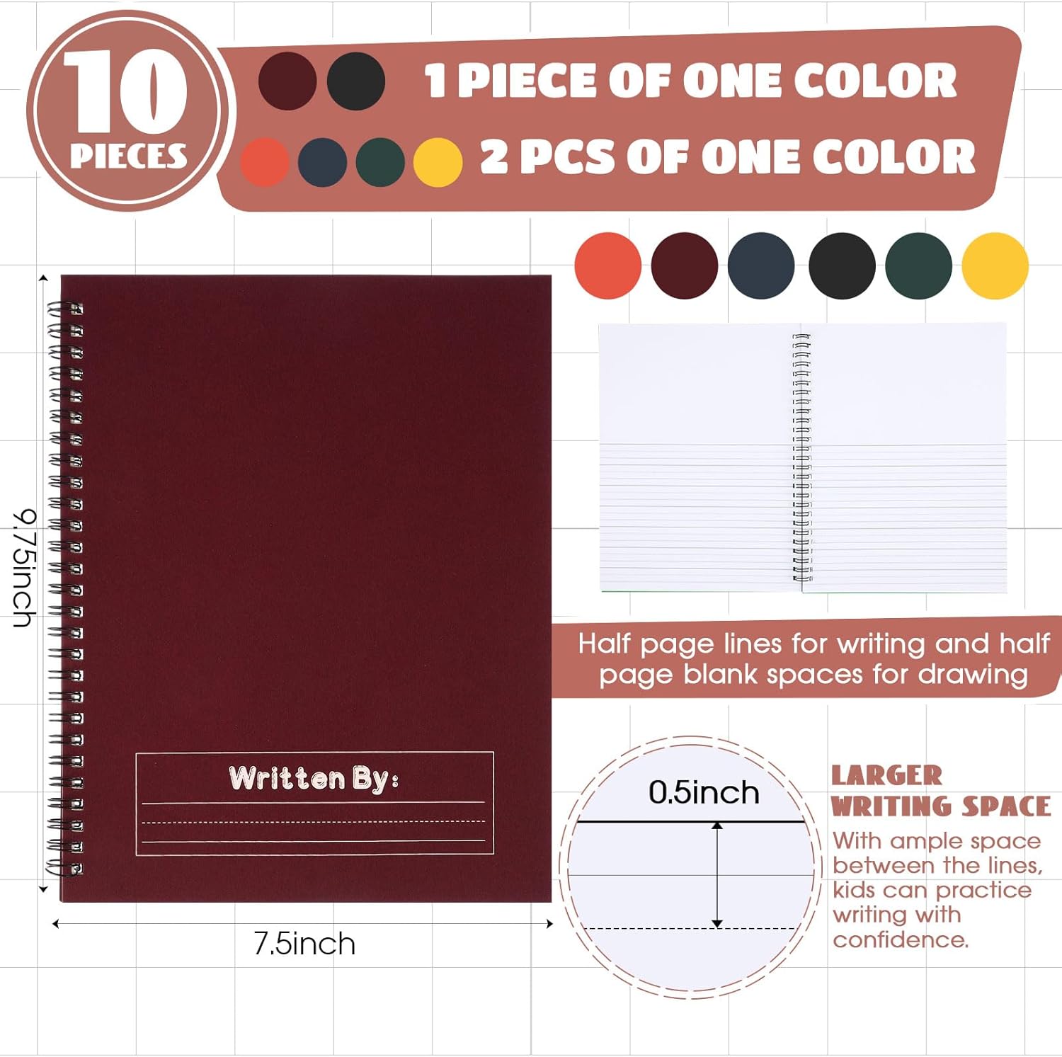 • Quality Materials: these primary journals are made of white card and paper, ensuring durability and a professional appearance; The covers are available in five vibrant colors, including red, orange, yellow, green, and blue and adding a festive touch to your writing experience