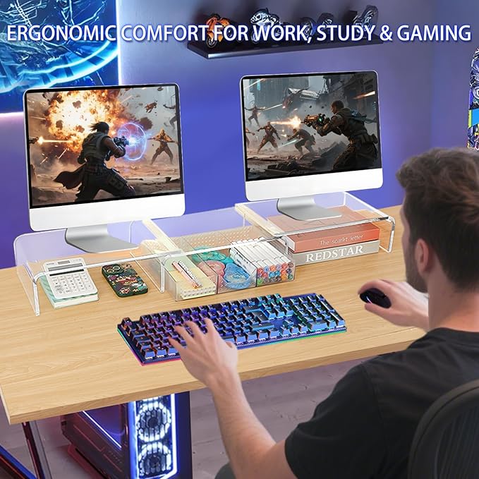 • 【Premium Materials】0.3" thick reinforced acrylic ensures unshakable acrylic monitor stand (holds 55lbs).Non-slip pads grip any desktop securely. Upgrade your workspace in seconds without tools.