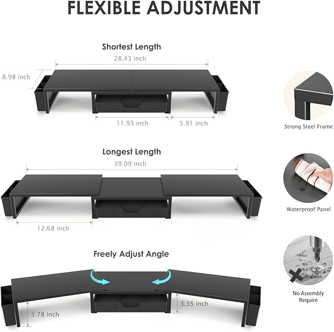 • 【 Dual Monitor Stand with Smart Storage】Clear workspace clutter effortlessly. Organize desk accessories & office supplies in handy 2 hanging pen holders and a drawer. Keep essentials visible and instantly accessible for better focus and efficiency