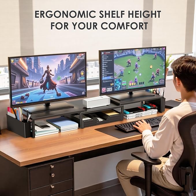 • 【Unlock Extra Space】Raise your monitor height with this monitor riser to free up space underneath. Store your keyboard, mouse, files, printer, gaming items, etc. neatly. Fits perfectly in any home, office, or dorm. Maximize desktop space and master desk organization