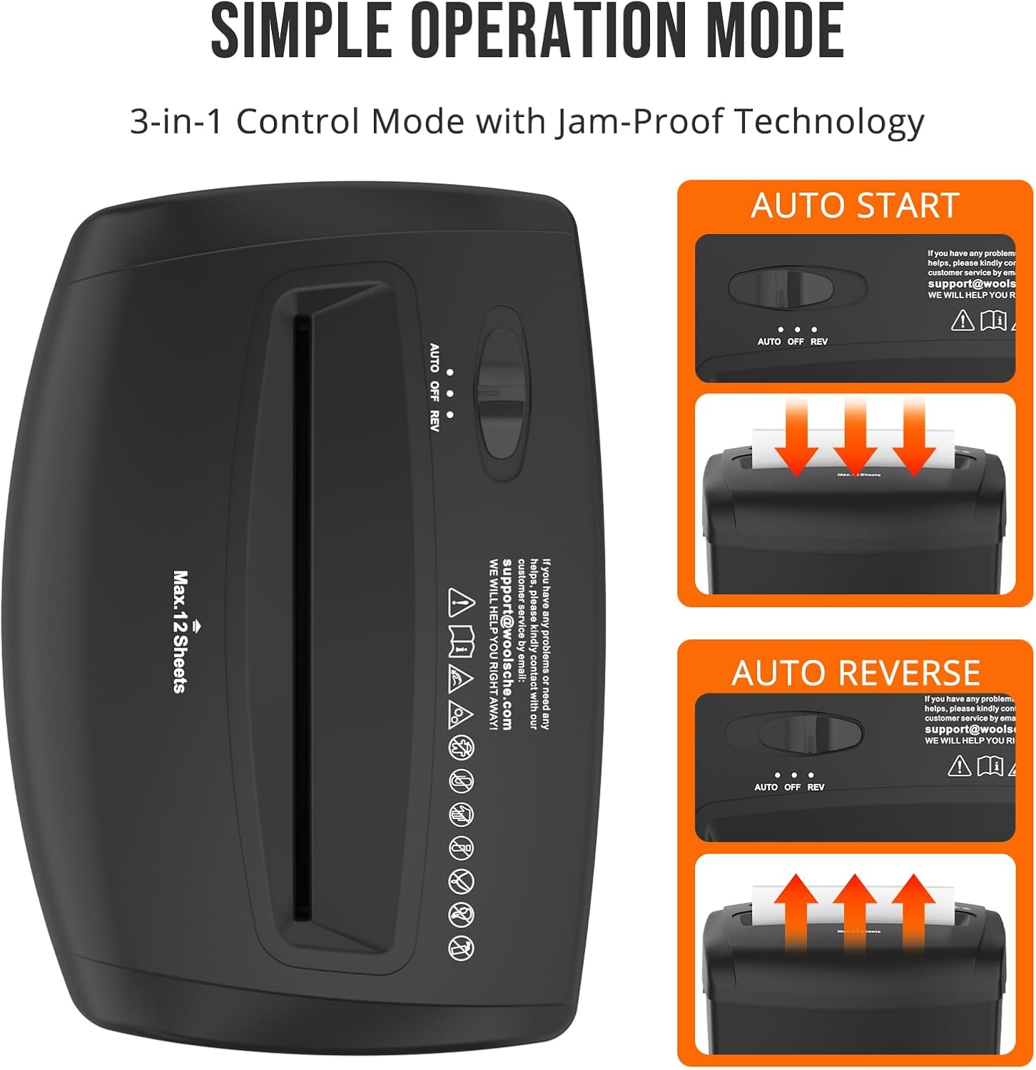 • Simple Operation Mode:3-in-1 control (Auto/Off/Reverse) with jam-proof technology. Auto-start/stop saves energy, manual reverse clears jams in seconds