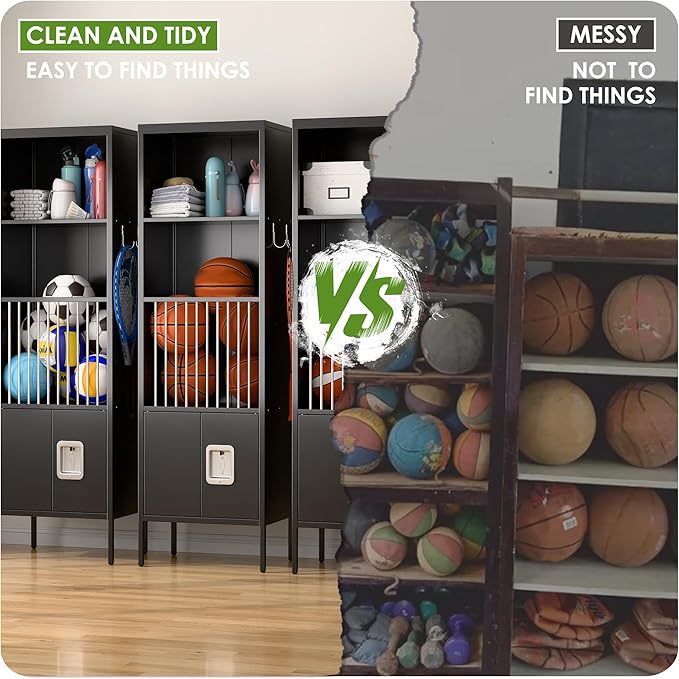 • Convenient Design: Spacious open compartments can storage access to water cups, towels and other items. High feet of lcoker to avoid moisture or put your shoes under your locker, can storage your sports balls inside the railings to avoid losing them and store essentials in the space inside the lockable door