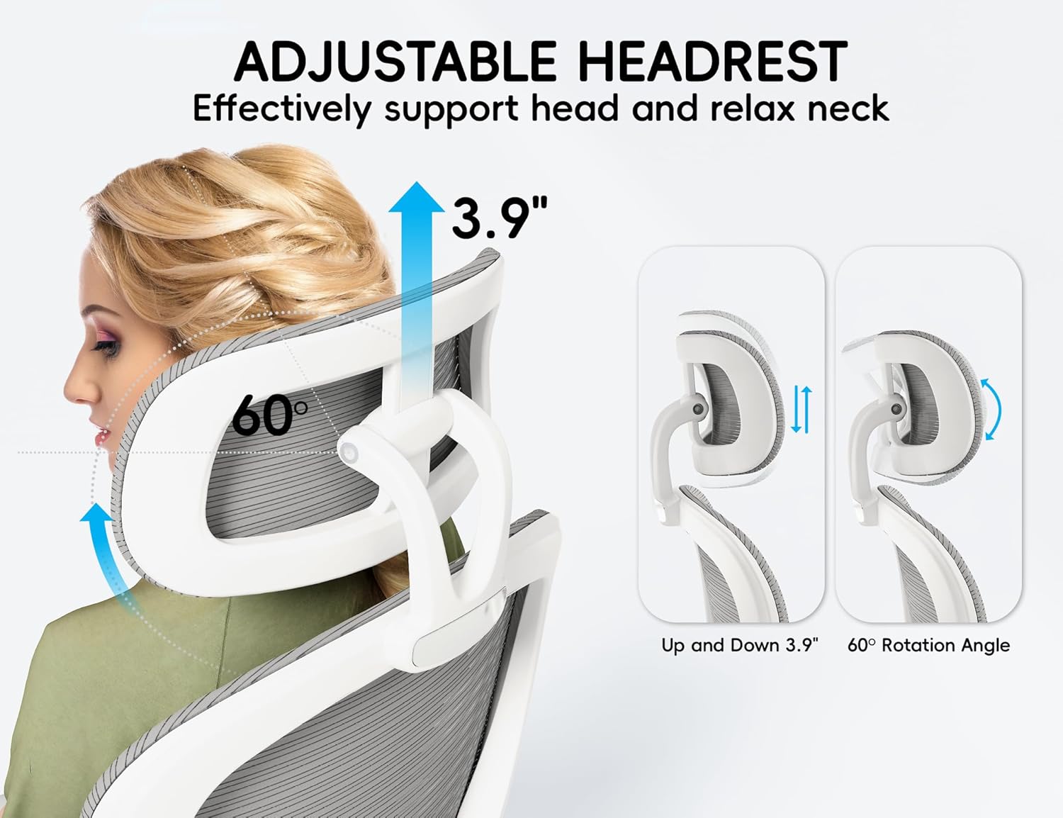 • Adjustable 3D Headrest for Neck & Shoulder Relief:Customize your comfort with our 3D adjustable headrest, designed to cradle your neck and shoulders in the ideal position. Tilt, height, and angle adjustments ensure proper alignment, reducing strain from hours at your desk. Finally, a chair that cares for your posture as much as you do