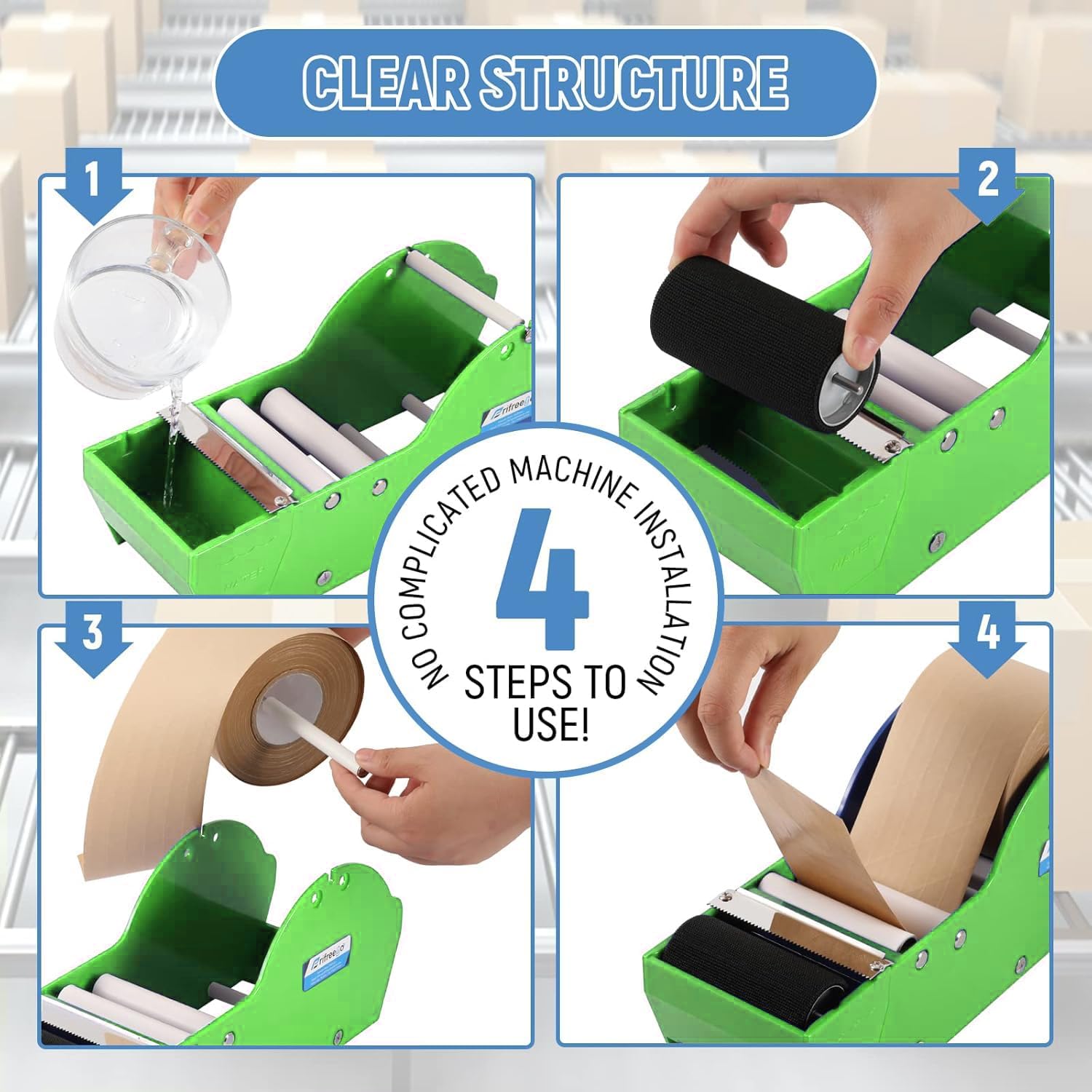 Water-Activated Tape Dispenser, Manual Kraft Gum Tape Dispenser, Width Adjustable 1.18-3.15", Light Weight & Portable Packing Tape Dispenser Set, Green