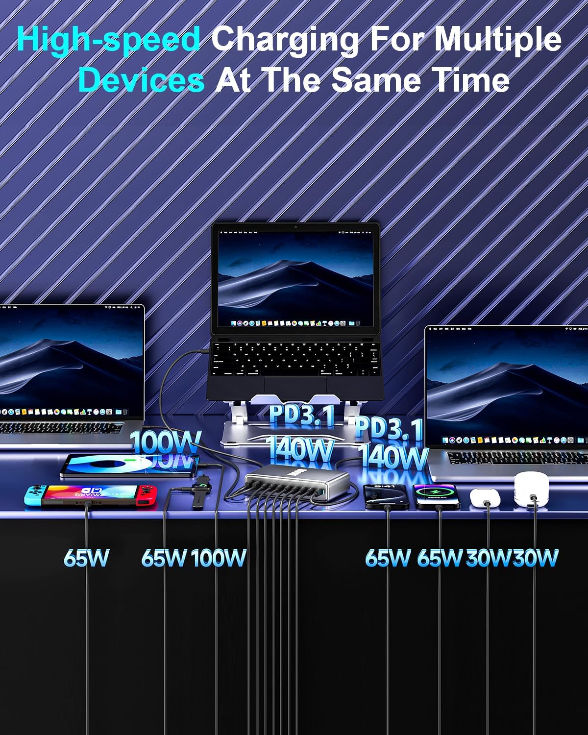 • Wide Compatibility: The 800W USB C charging station supports PD3.1,PD3.0/PPS, QC, PE2.0, AFC, FCP, SCP, 5V/3A fast charging protocols and is compatible with MacBook Pro 16“, 14”, 13”, MacBook Air, iPad Pro , iPhone 16 Pro/15 Pro/14 Pro Max/13/12, Switch, Samsung Galaxy S23 Ultra/S22, Steam Deck and more