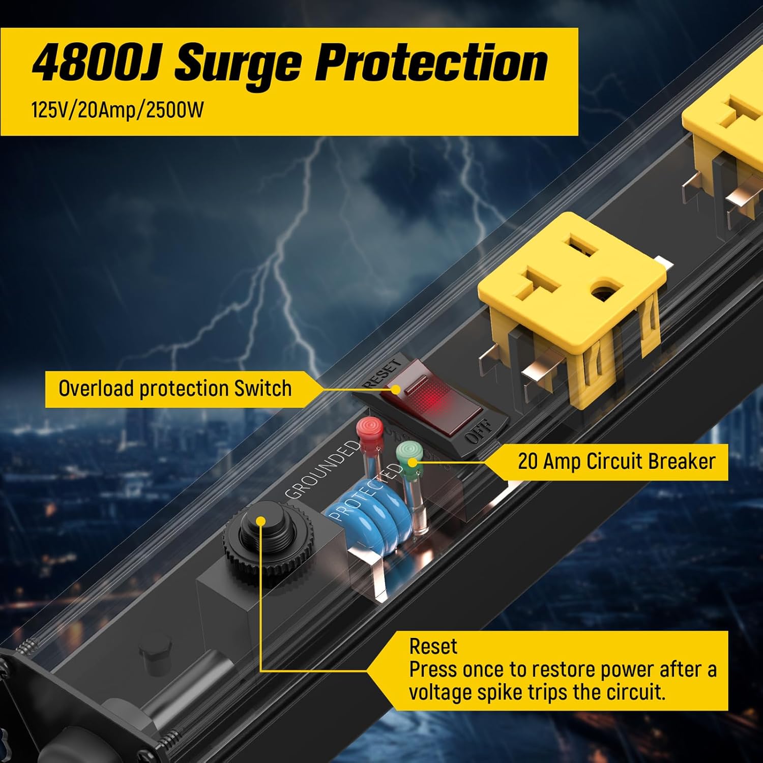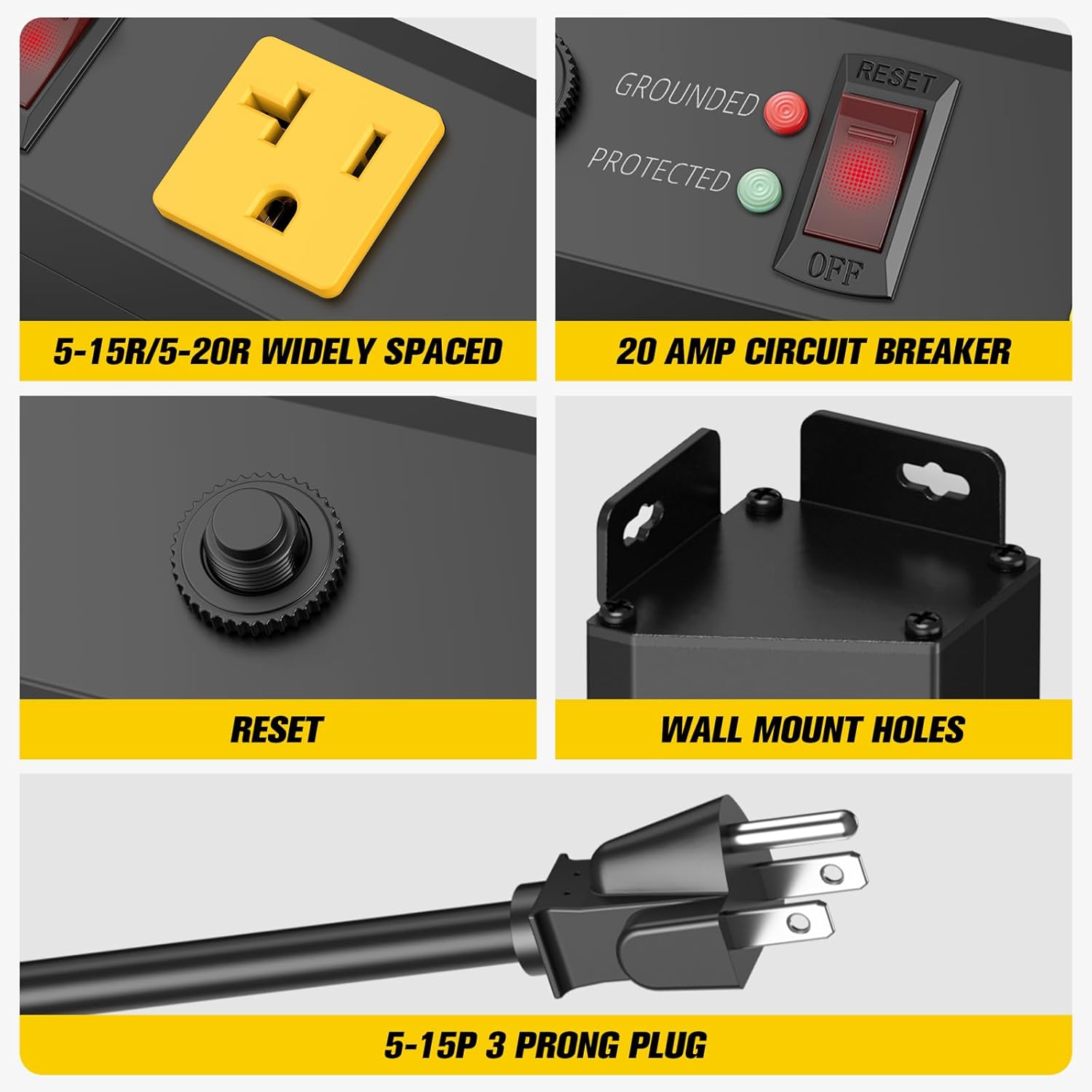 • Garage power strip Output rating - 125V/20Amp/2500W. The shop power strip come an ON/OFF switch. Built-in 20A circuit breaker, With 15 gauge 5-15P extension cord, power strips with 4800J surge protection, 5-15R/5-20R T-Slot adapter for more appliance