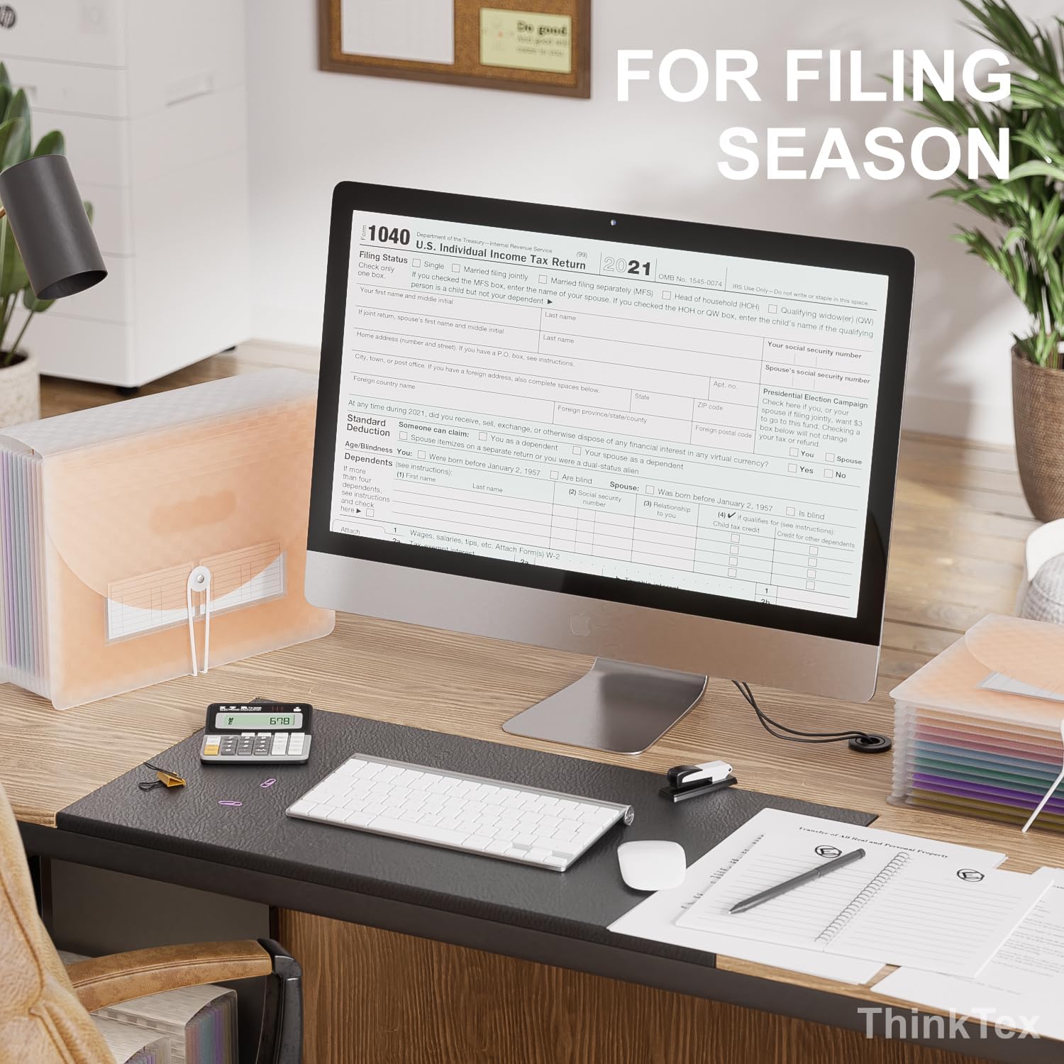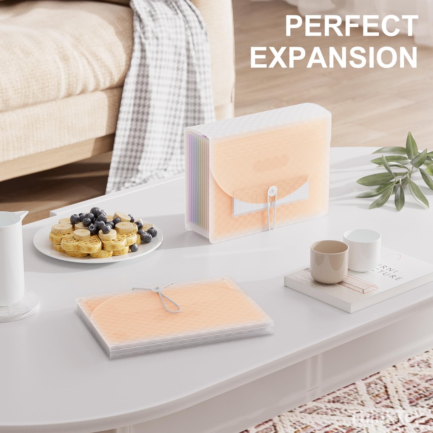 • HOMEOFFICE FILE ORGANIZER:ThinkTex Portable accordion file organizer, with both the top and bottom expandable. It has 12 dividers and 13 pockets, as well as removable colorful monthly labels. Suitable for letter/A4 size documents, it can keep your tax files, monthly bills and receipts neatly organized.