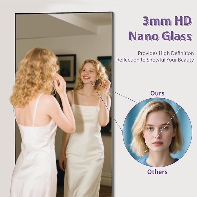 • High Quality and Safety Guarantee: The floor mirror is made of 3mm HD nano glass which provides high definition reflection. The back features an anti-explosion film, even if it's accidentally damaged, shards won't scatter everywhere, safe for surrounding children or pets