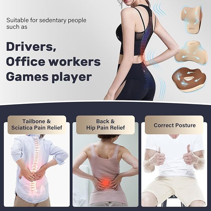 Coverado Seat Cushion and Lumbar Support Headrest Pillow for Car Office Chair, Ergonomic Memory Foam Chair Cushion Back Neck Support Pillow, Sciatica & Back & Tailbone Pain Relief Cushion-Beige