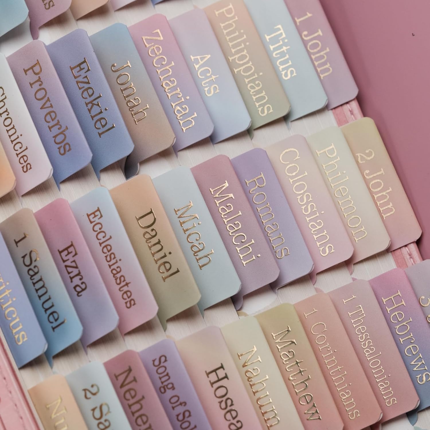 • Large Print, Easy to Read & Easy to Install:Silky velvet touch laminate,carefully designed pretty Bible accessories . The peel-and-stick Bible index tabs are self adhesive, simply align them with the provided guide or place them creatively.