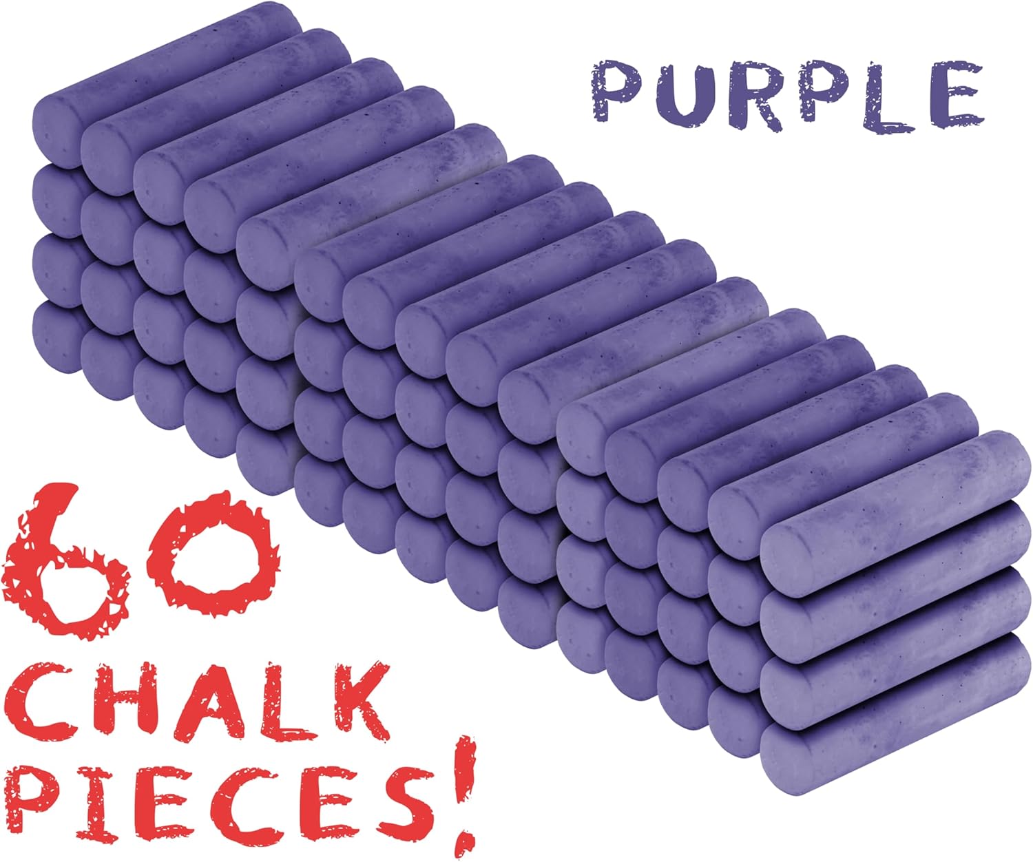 • 60 Count Purple Chalk - 1 Pack: Includes one pack with 60 bold purple sidewalk chalk sticks, perfect for endless hours of outdoor fun. Great for group activities, school projects, or stocking up your art supply shelf with a favorite color.