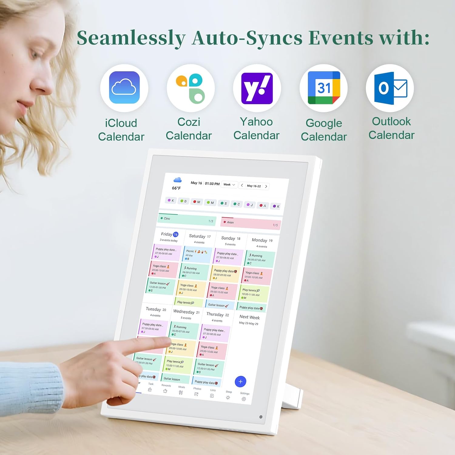 • ✅Easy Setup, Seamless Calendar Syncing: Plug in, connect to Wi-Fi, and sync your calendars in minutes. Compatible with Google, iCloud, Outlook, Cozi, and Yahoo. Add events directly on the device or through the our app.