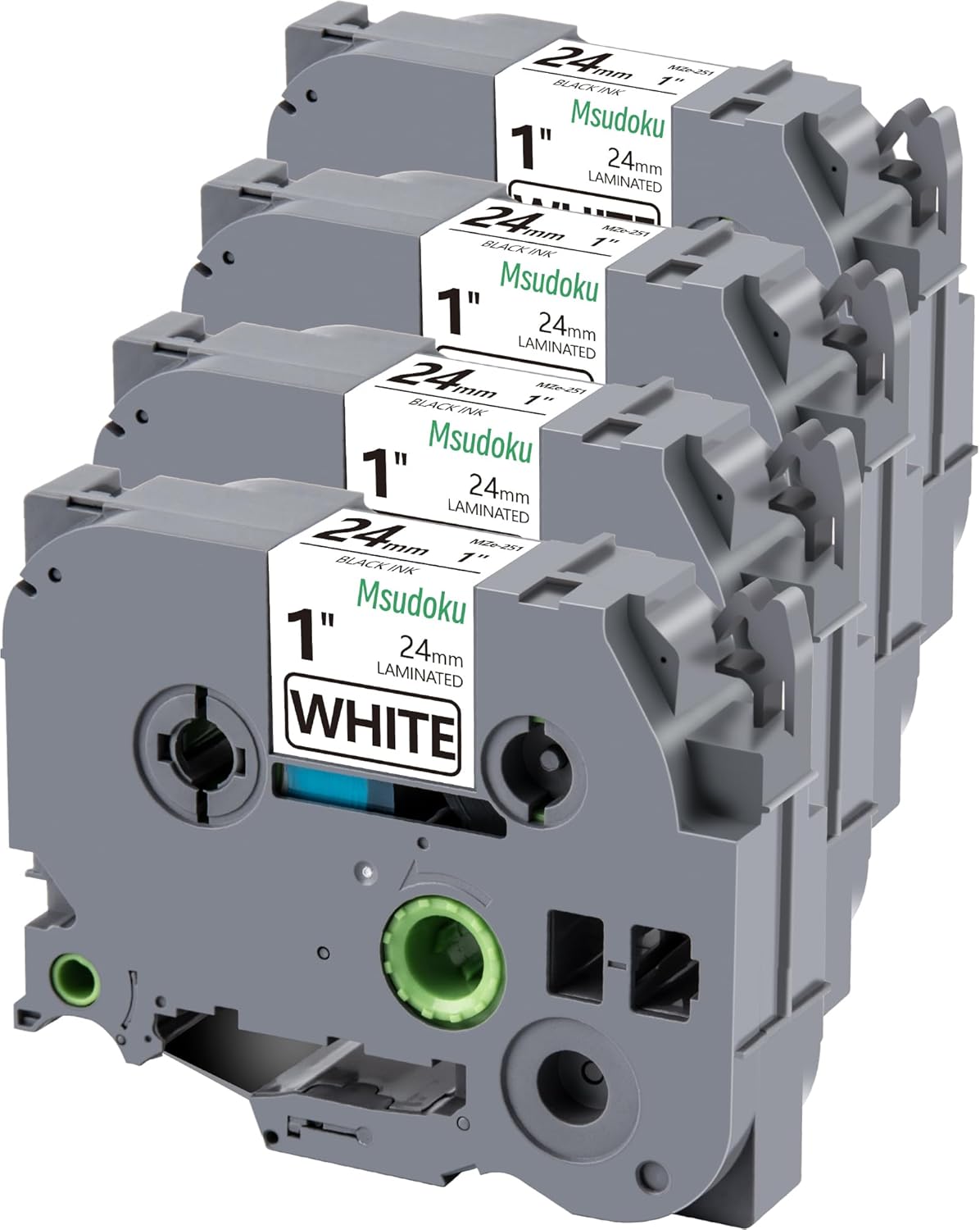 • Package Contents: 4PK 24mm MSUDOKU label tape cassettes (compatible with Brother TZE-251/TZ-251/TZ251 standards), each measuring 1" × 26.2 ft (24mm × 8m) with black print on white tape