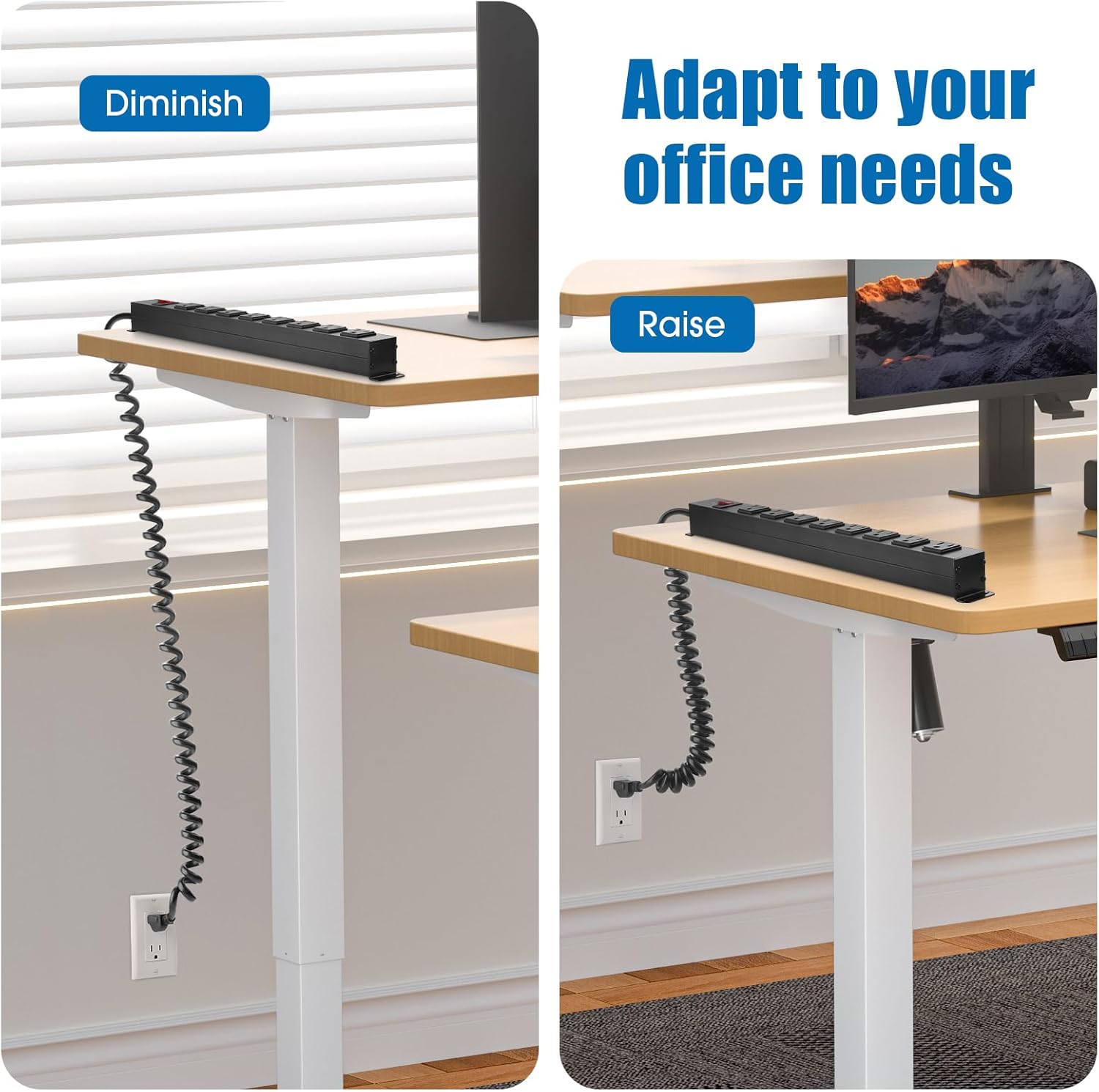 • Spring Cord Power Strip: Equipped with a 4 foot spring-loaded cord to keep things neat and organized while extending the length of the power cord, perfect for height-adjustable standing desks and your other needs.