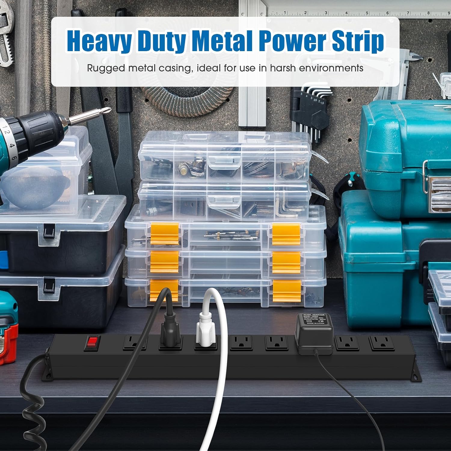 2Pack 8 Outlet Metal Wall Mount Power Strip, Mountable Outlet with Switch, Heavy Duty Wide Spaced Surge Protector, 10 FT SJT 14AWG Black Spring Cord.