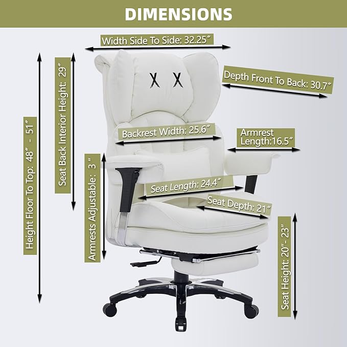 • Ergonomic White Office Chair for Stylish Comfort This white office chair combines fashion and function, designed to support your spine and reduce fatigue during long hours. The high-back office chair includes a plush headrest and padded lumbar pillow for enhanced comfort. Its extra-wide seat makes this big and tall office chair perfect for working, studying, or gaming. Ideal as a computer chair, gaming chair, or executive office chair.