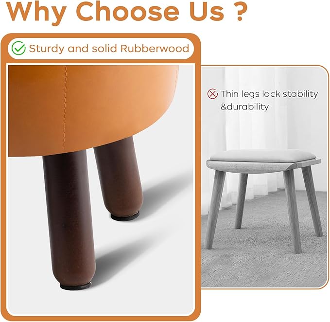 • 【Anti-Slip Design】- These leather foot stools small ottoman rubber legs come with dedicated felt pads to prevent scratches on floor and keep it from sliding.Wood leg with non-slip felt pad is quiet when moving, and can avoid leaving scratches on floor.The small footstool is perfect for small spaces and is compact enough not to get in anyone's way.