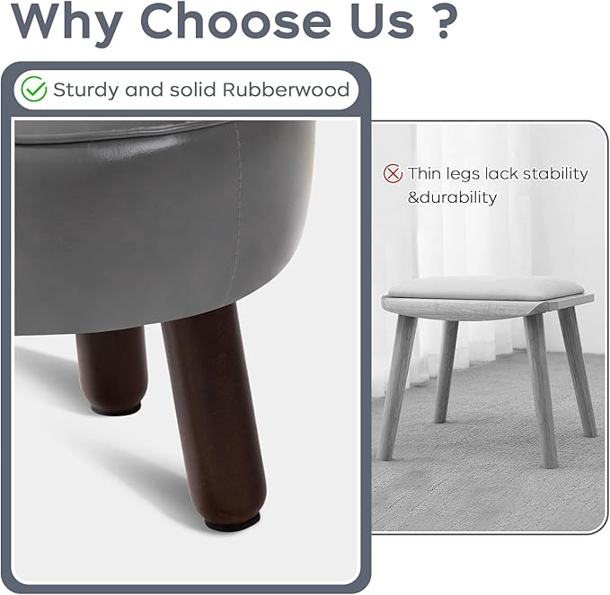 • 【Anti-Slip Design】- These leather foot stools small ottoman rubber legs come with dedicated felt pads to prevent scratches on floor and keep it from sliding.Wood leg with non-slip felt pad is quiet when moving, and can avoid leaving scratches on floor.The small footstool is perfect for small spaces and is compact enough not to get in anyone's way.