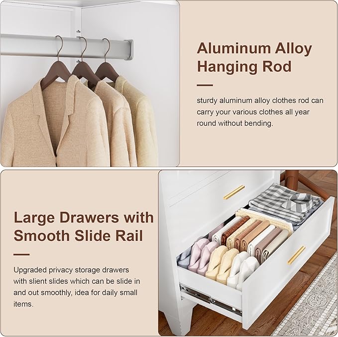 • Convenient Drawers Design: The bedroom armoire includes two spacious drawers at the bottom, providing storage space for smaller items such as underwear, socks, or others. The smooth glide system ensures a hassle-free opening and closing