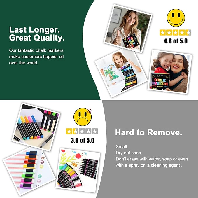 • High Quality. The chalkboard markers come with more volume of ink, nontoxic, odorless, and dust-free, made of premium quality, last in a long time.