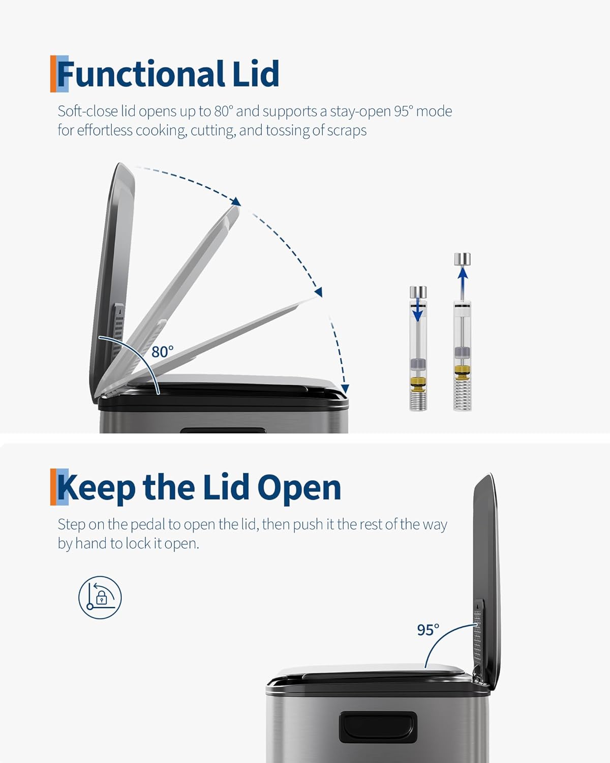 • [PRACTICAL DESIGN] – GarveeHome’s dual trash and recycling bins put ease of use first. Ergonomic side handles let you lift and relocate the entire unit effortlessly. The soft-close lid opens to 80° without collision with standard kitchen island edges, and locks at 95° for hands-free cooking prep and scrap disposal. Dual inner buckets with weighted-edge lids trap odors separately. A custom liner ring secures any standard bag snugly, eliminating slips, bunching, and overhang