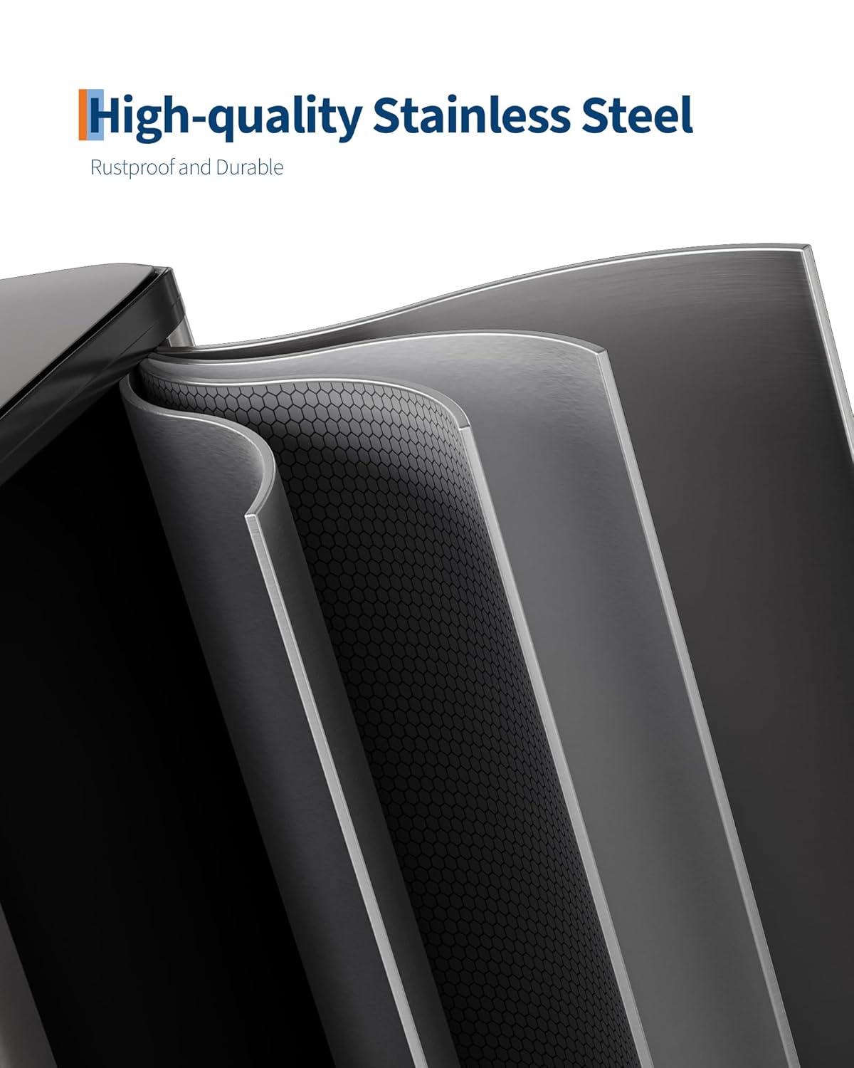 • [HIGH-QUALITY MATERIALS] – GarveeHome stainless steel trash can with lid is engineered for longevity. Its 410-grade ferritic stainless-steel shell delivers rustproof strength, scratch resistance and lasting luster. Two polypropylene inner buckets repel stains, odors and moisture. A thick ABS lid with stainless overlay resists dents; the industrial steel pedal endures 150,000+ steps and the one-piece ABS hinge survives over 300,000 open/close cycles