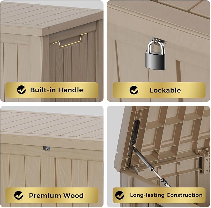 • Material: The patio outdoor storage box is made of the latest high-quality resin material, which makes this patio deck storage box waterproof, UV-resistant, anti-fading, and anti-bending protection, suitable for long-term outdoor use.