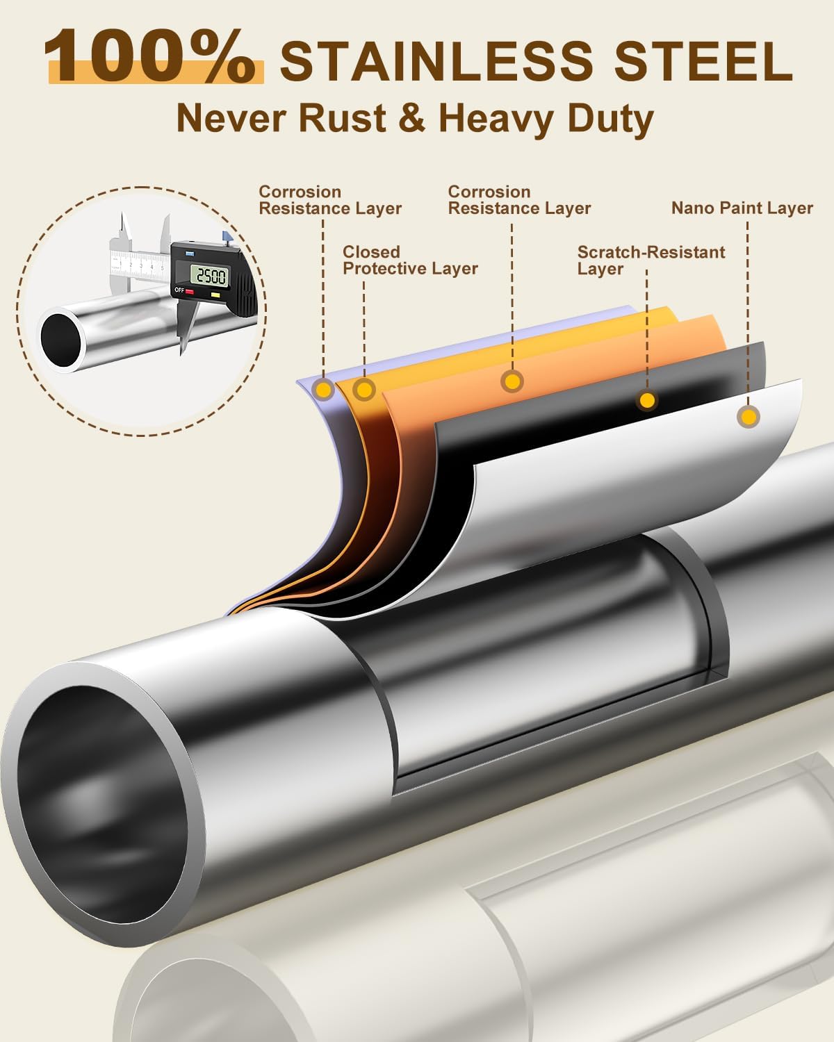 • 100% STAINLESS STEEL STRENGTH - ENJOY 760 LBS & RUST-DEFYING! Boasting an industry-leading 760 lbs weight capacity, 50% stronger than competitors, our NEWEST clothes rack confidently handles your heaviest garments. It features 100% stainless steel design, with even the smallest screws made of the same high-quality material. We've implemented a cutting-edge five-layer coating process, including an extra protective sealant layer, ensuring your rack remains rust-free and resistant to wear and tear.