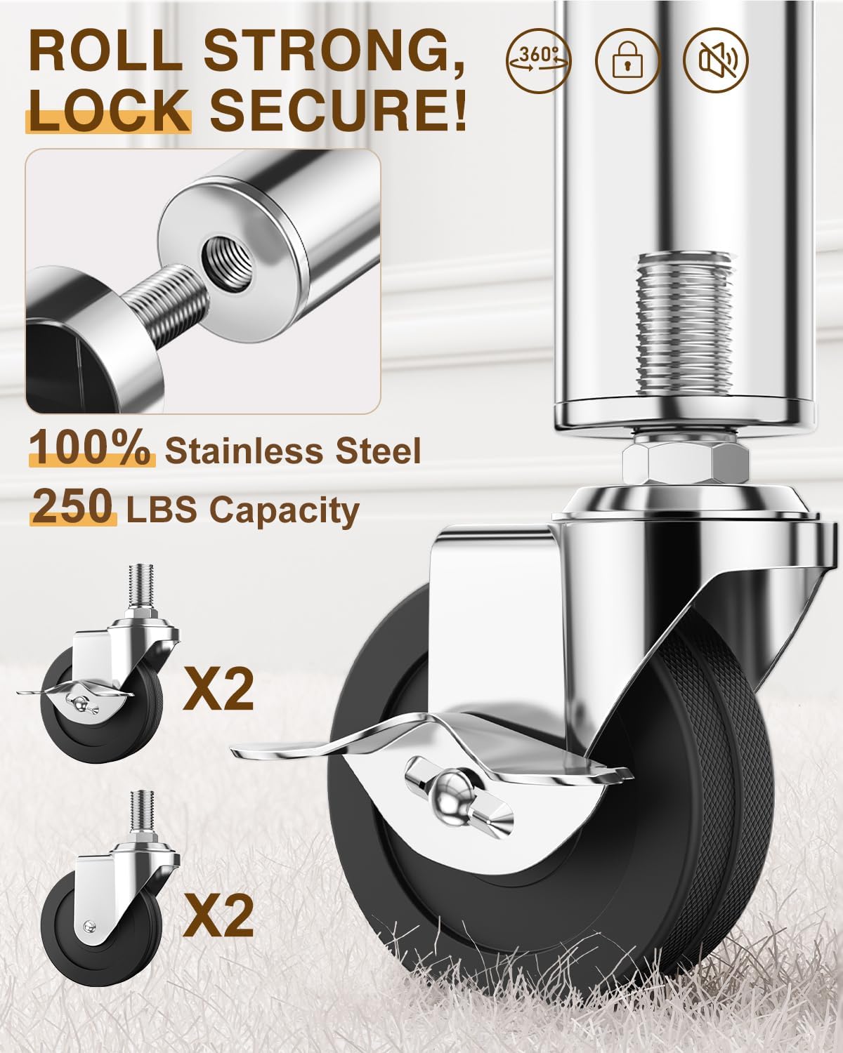 • UPGRADED STAINLESS STEEL—NO MORE WHEEL BREAKING! We've replaced weak plastic parts with durable stainless steel fittings and upgraded to larger, heavy-duty wheels that won't bend or crack under heavy loads. The smooth 360° swivel design makes repositioning effortless, even when the clothing rack with shelves is fully loaded. Two wheels are lockable for added stability, and the upgraded design is both quiet and safe for all floor types. Fybee clothes rack, built to last, built for convenience.