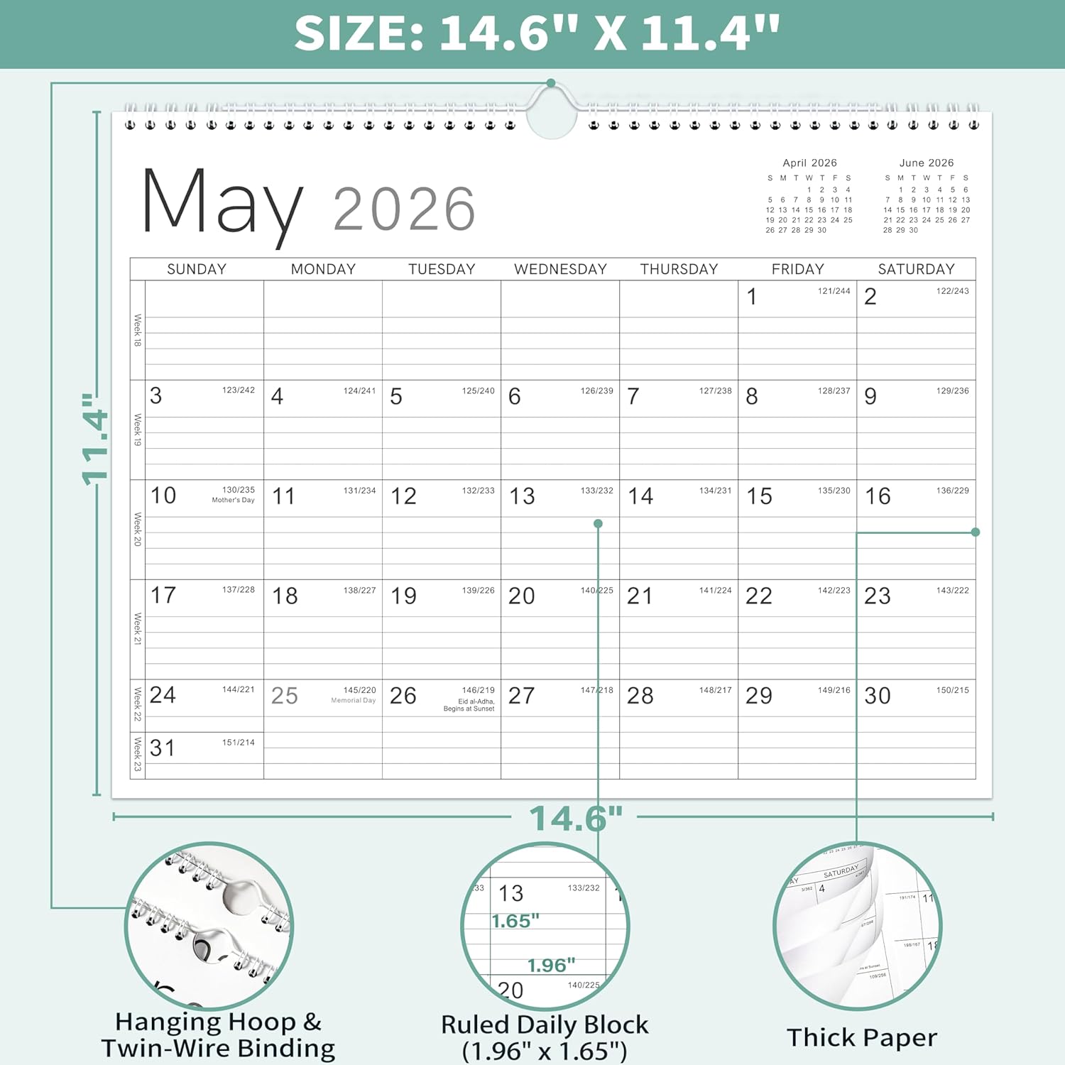 • Functional Details - The strong twin-wire binding of this 2026 wall calendar makes it turn pages easily. Use the hanging hoop to hang the 2026 calendar on your wall, which helps you save some space and keeps the date in view.