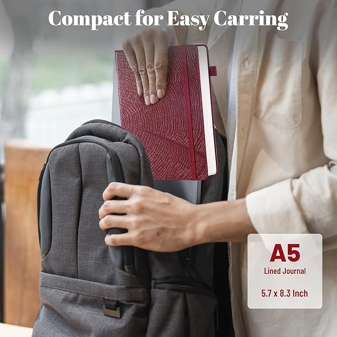 • ๐•๐ž๐ ๐š๐ง ๐‹๐ž๐š๐ญ๐ก๐ž๐ซ ๐๐จ๐ฎ๐ง๐ ๐‰๐จ๐ฎ๐ซ๐ง๐š๐ฅ:The cover features a tree growth ring pattern, lightly embossed onto cruelty-free vegan leather. The textured cover adds visual interest and sets it apart from plain designs. The tree ring pattern represents personal growth, accomplishments, and the challenges along the way. 5.7 ร— 8.3 inches, compact and easy to carry