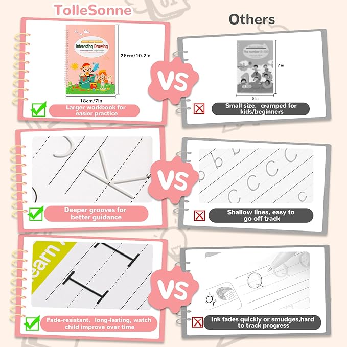• 【Fade-Resistant Pens Show Clear Progress】Grooved handwriting book includes cute, kid-friendly pens with fade-resistant ink that won’t smudge or disappear—unlike other brands. Kids stay engaged, and parents can clearly see progress over time in every practice copybook.