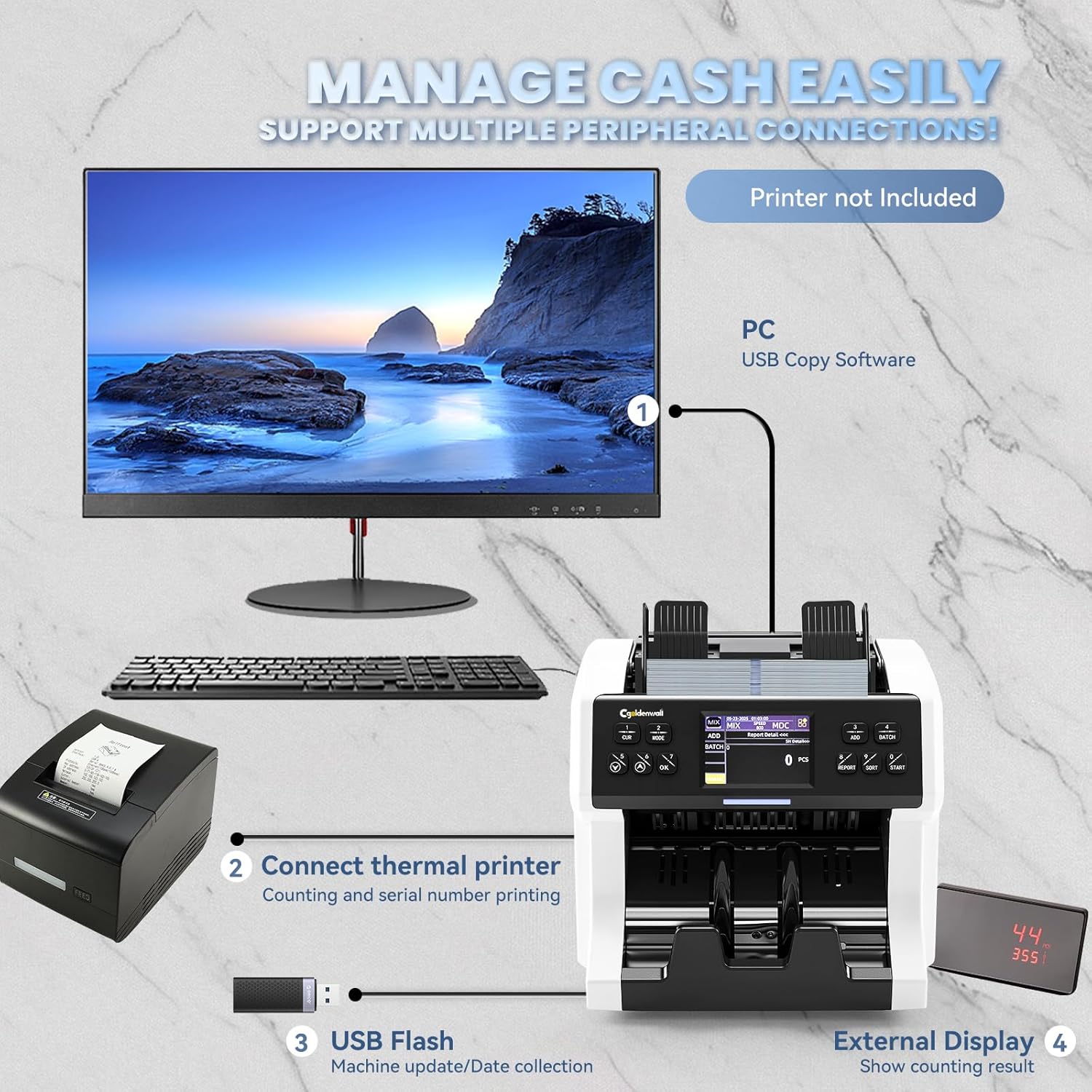 • Boost Your Efficiency: NEW Upgraded Bill counter machine mixed denomination counts and reports total value, clear breakdown of quantity and value by Denom, and serial number. The machine is low noise and durable. The user-friendly TFT touch screen with key buttons makes your cash counting job as easy as possible. The upgraded accessories makes the counting process smoother. Ideal for grocery stores or casinos to deal with heavy cash-counting jobs.