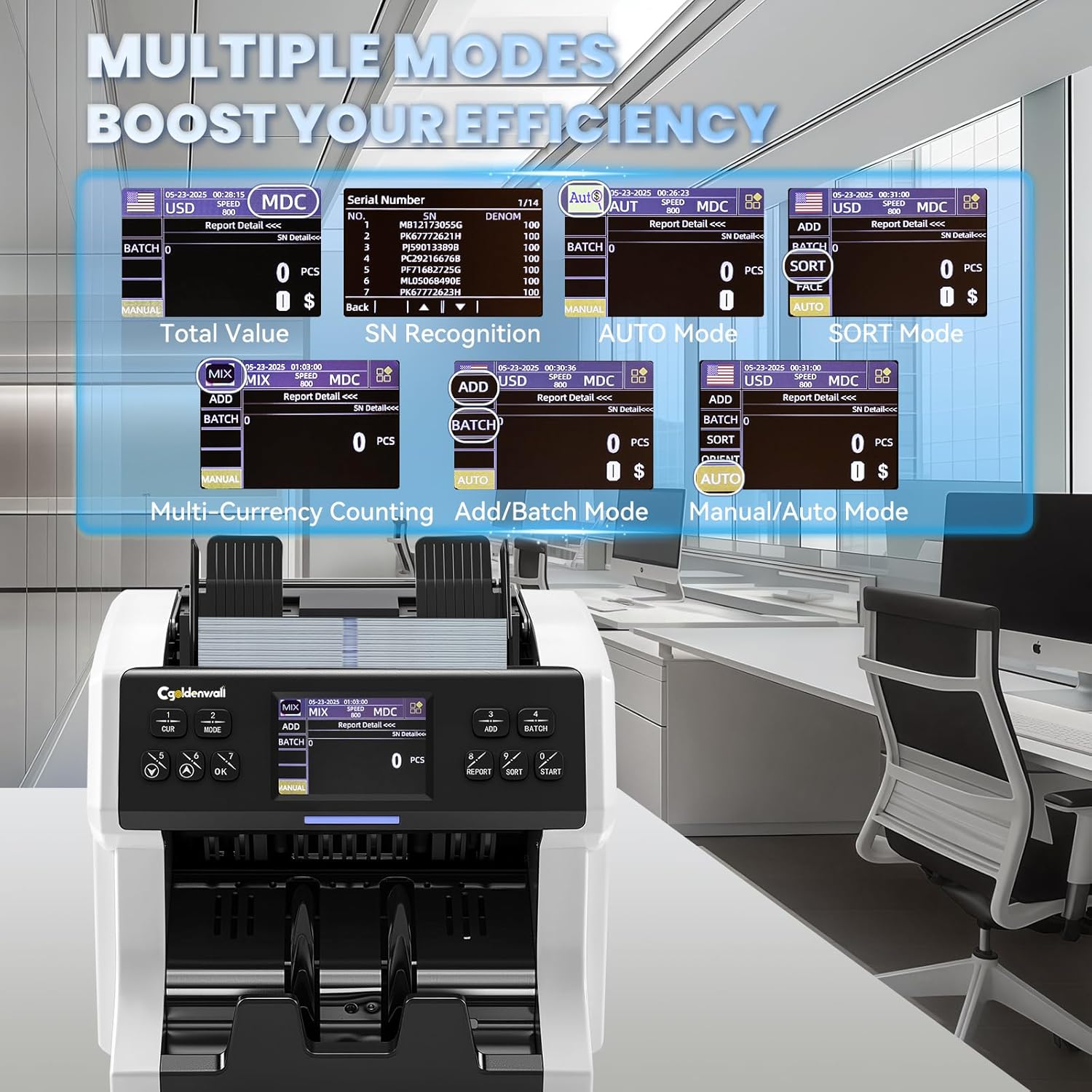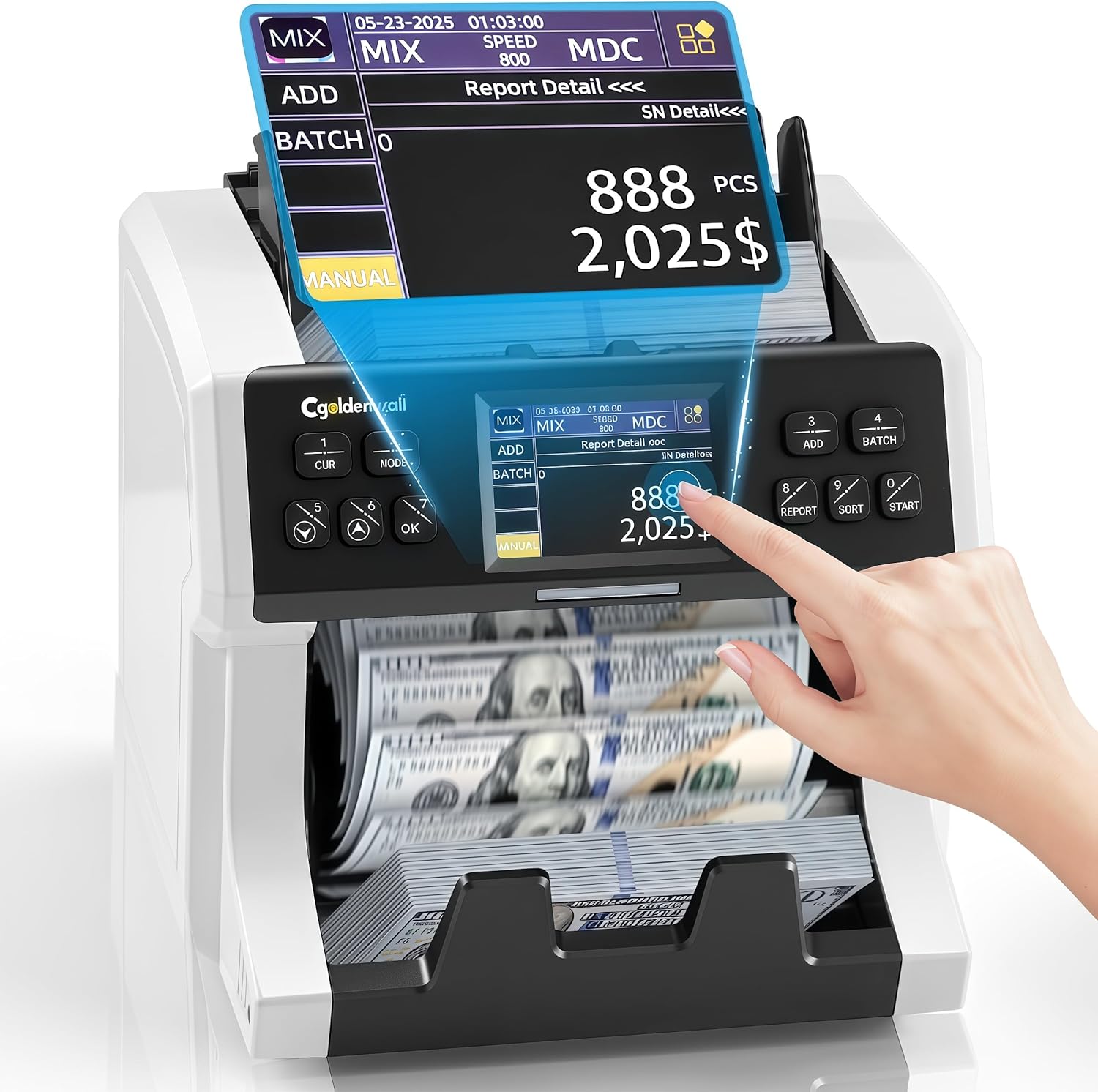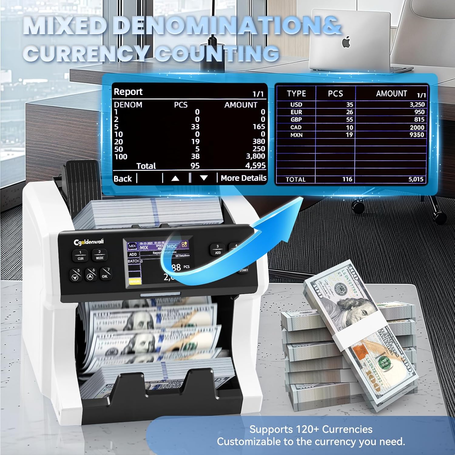 CGOLDENWALL Money Counter Machine Mixed Denomination,Bank Grade Cash Counter 2CIS/UV/IR/MG Counterfeit Detection,Serial Number,MUL Currency Value Counting, Sort&Printer Compatible Bill Counter,1500N/M