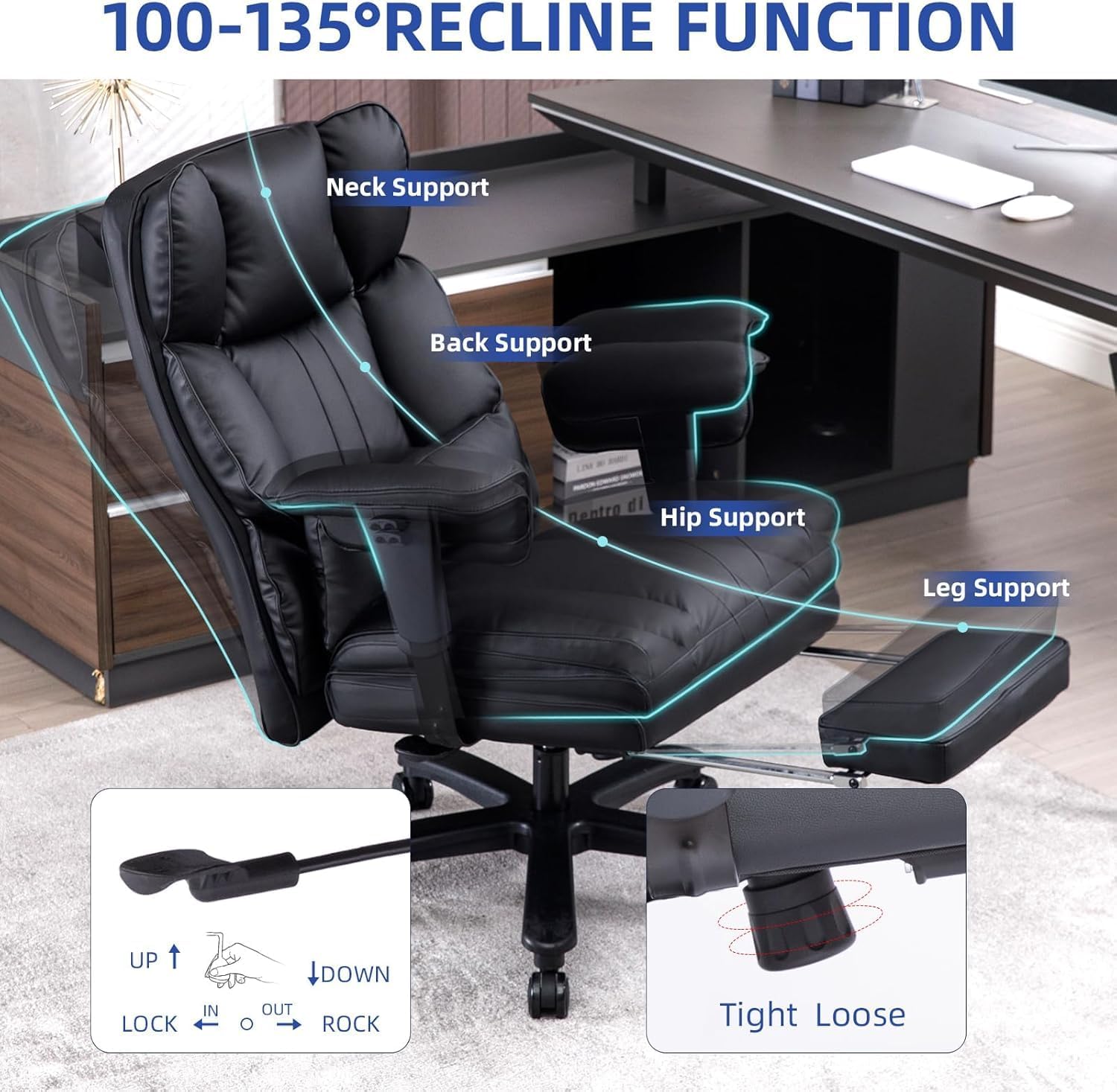 • 𝑨𝒅𝒋𝒖𝒔𝒕𝒂𝒃𝒍𝒆: Home office desk chair discovered with a retractable footrest. Executive office desk chair with adjustable height 3.55" armrest. Comfy reclining office chair with a tilt range of 100° to 135°.