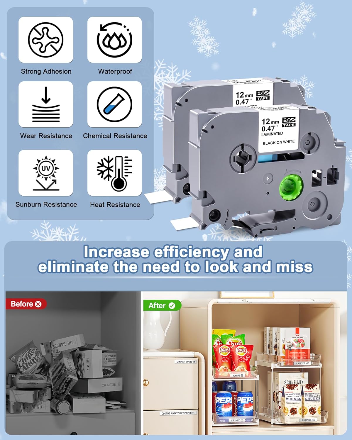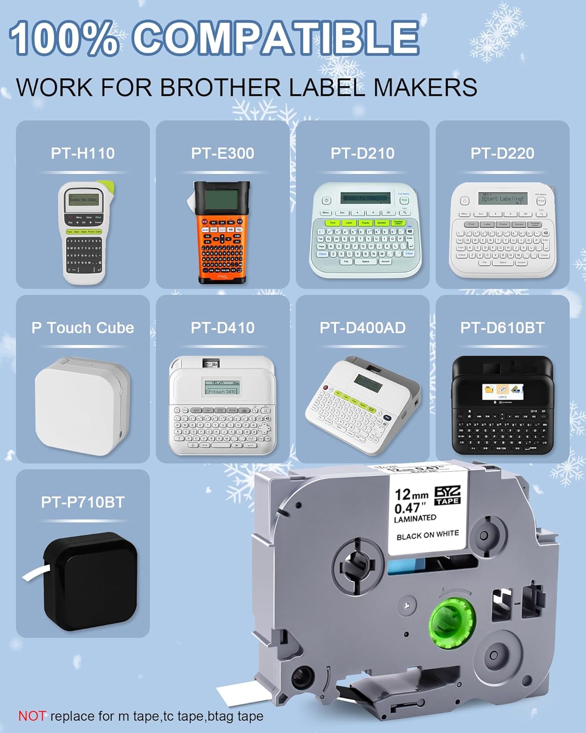 • Easy to Apply: The split back of Compatible with Brother tz tape is easy to remove, no sticky residue remains when the labels are removed, which makes the replacement label tape easy to peel and apply to multiple surfaces,keep the sticky side clean and dry before using 12mm.47 laminated white tz tape,the label will work