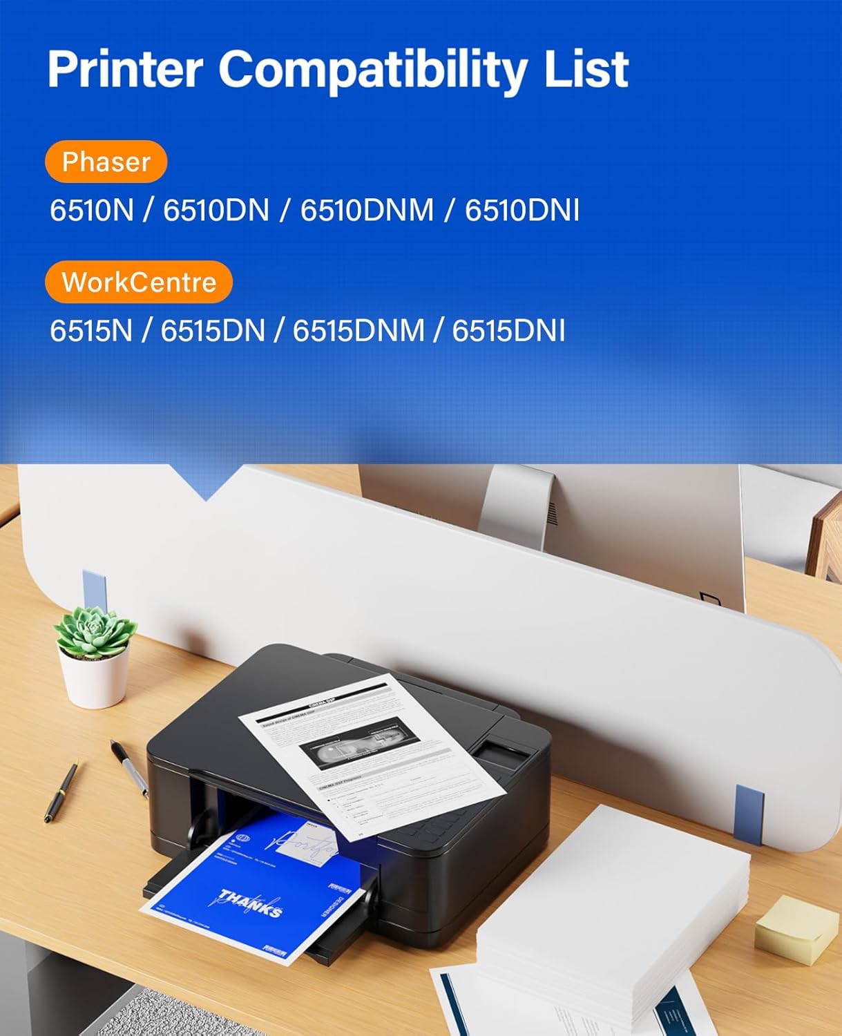 • Compatible Printer: Xerox Phaser Series:6510N, 6510DN, 6510DNM, 6510DNI, WorkCentre Series:6515N, 6515DN, 6515DNM, 6515DNI; Compatible Toner Model: 106R03480, 106R03477, 106R03478, 106R03479
