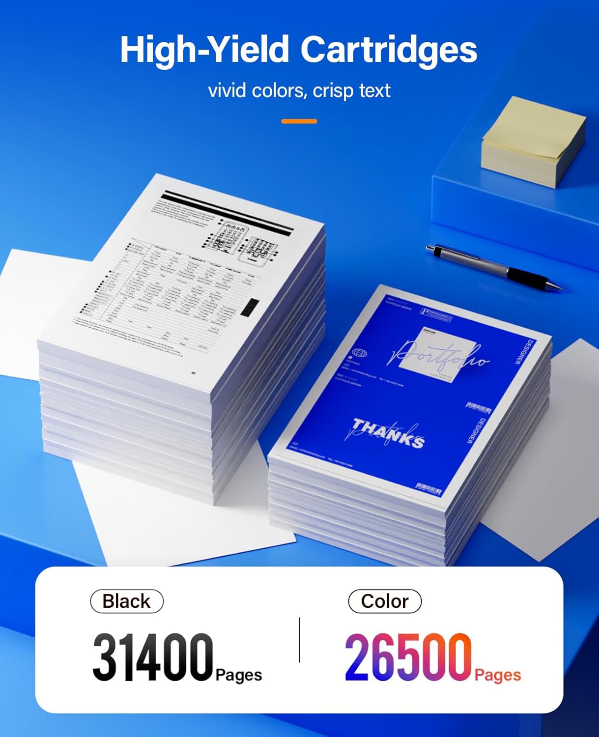 • Yield & Version: 31,400 pages for Black and 26,500 pages Color toner cartridge (A4, 5% Coverage),High Yield Version C9000 toner cartridges.