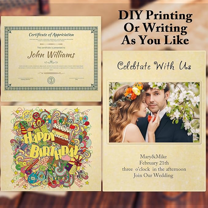 • Work As Different Things: these plain certificate papers are flexible in use, you can use them as certificate printing, wedding invitation, birthday invitation, restaurant menu, theme party decoration and so on, running smoothly in laser and inkjet printers, copiers and offset applications without jams