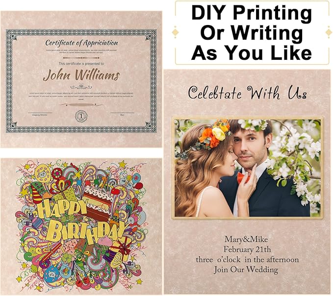 • Work As Different Things: these plain certificate papers are flexible in use, you can use them as certificate printing, wedding invitation, birthday invitation, restaurant menu, theme party decoration and so on, running smoothly in laser and inkjet printers, copiers and offset applications without jams