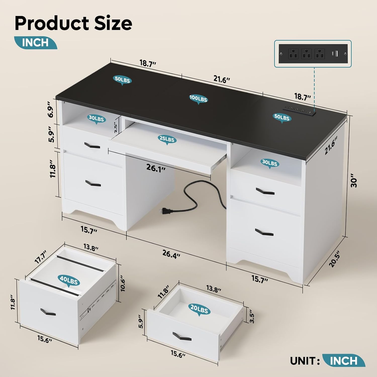 Bestier 59” Computer Desk with 4 Drawers, Office Desk with Storage, Modern Executive Desk with Charging Station, Keyboard Tray & Wooden Pedestals on Both Sides for Home Office & Studio, White