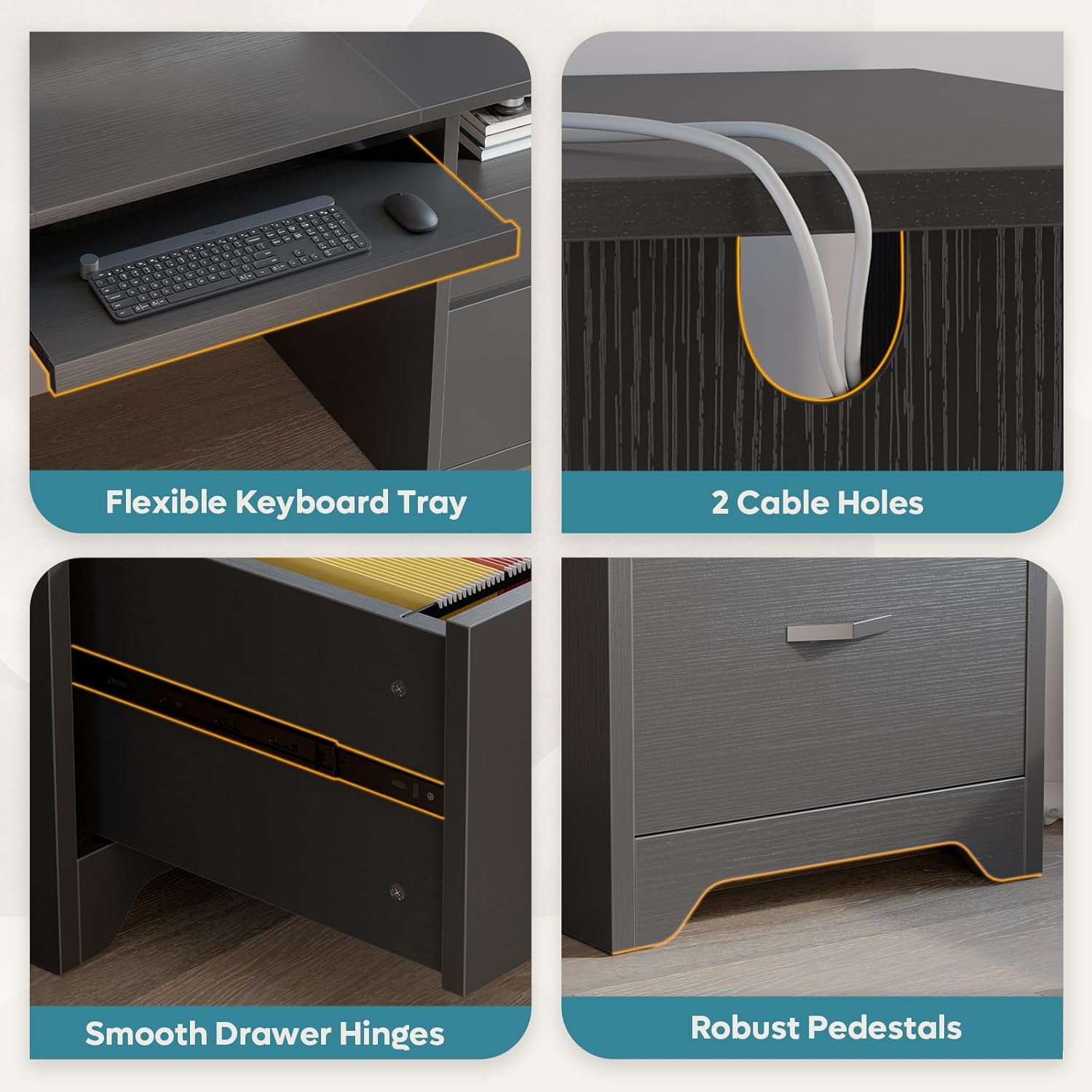 • Ample Storage & Organization: With two open storage compartments for frequently used items and four smooth-glide drawers—two for office supplies and two for letter/A4/legal-size hanging files—this pc desk keeps everything within arm’s reach. Premium drawer slides ensure smooth operation, so you can retrieve your essentials quickly