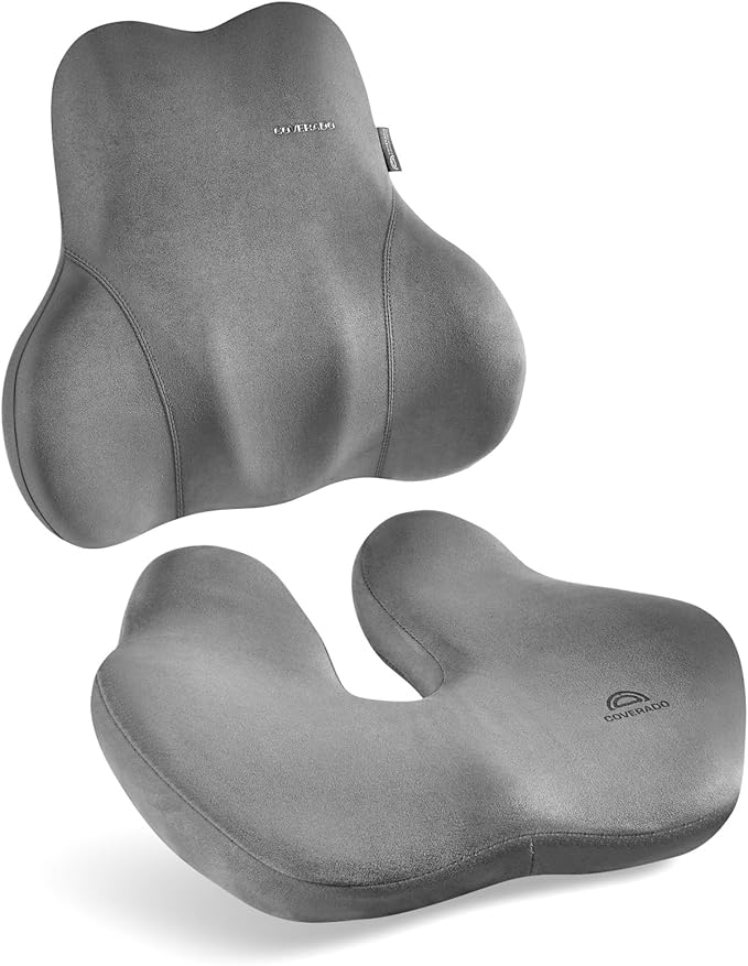 Coverado Memory Foam Car Seat Cushion and Lumbar Support Pillow for Car, Ergonomic Office Chair Cushion for Lower Back Pain Relief, Breathable & Non-Slip for Car, Home, and Office Use, Gray