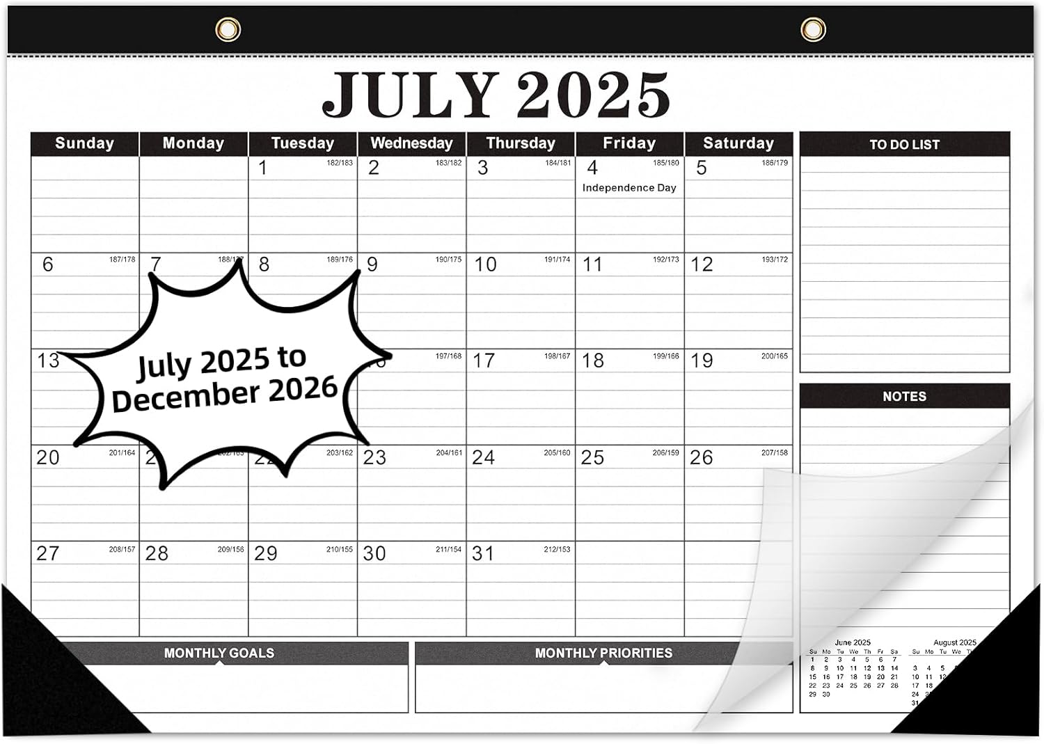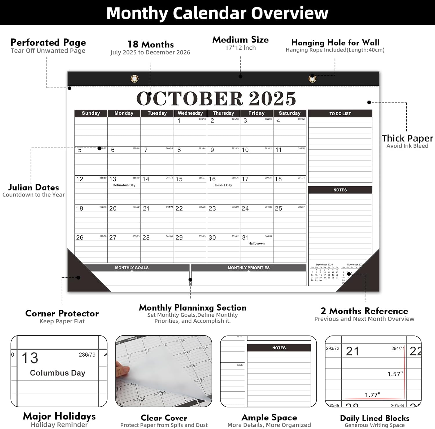 • Clear Waterproof Cover & Corners Protector: Our 2025 - 2026 calendar with a waterproof transparent cover and protector corners to protect the pages from spills and dirt, can keep for a long time use. Two sturdy hanging points + included rope let you hang it anywhere—use vertically as a wall calendar or flat as a desk calendar.