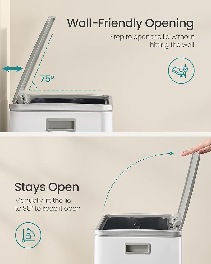 • Hands-Free & Noise-Free: The foot pedal offers a hands-free waste disposal solution, and the soft-close lid is designed to close both slowly and quietly, eliminating any loud noises