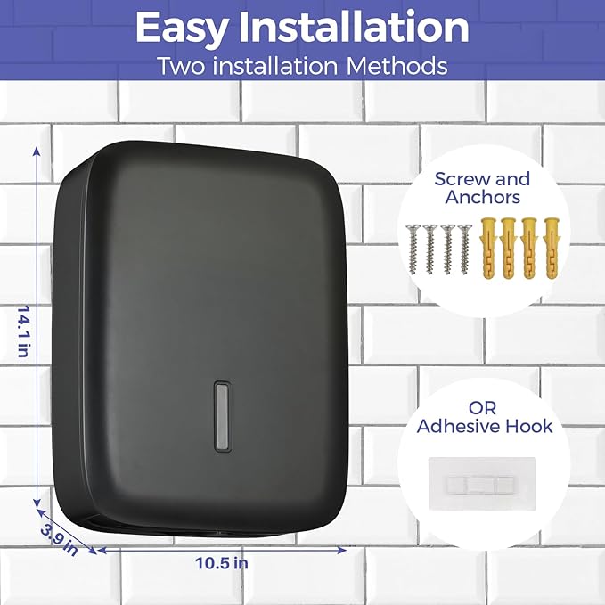 • Two installation Methods - Easily install the paper towel dispenser using the provided screws and anchors, Or no drill on the wall and mount using adhesive hook.