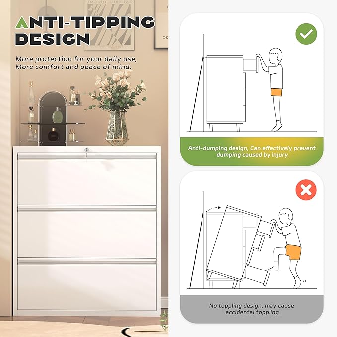 • ❤ Lockable File Cabinet -- Superday three drawer file cabinet uses an interlocking system, it locks all two drawers simultaneously and comes with two keys to protect your privacy and file security.Tips: 2 keys should be kept separately in case of losing. If you accidentally lose one key, another key can be used in case of emergency.