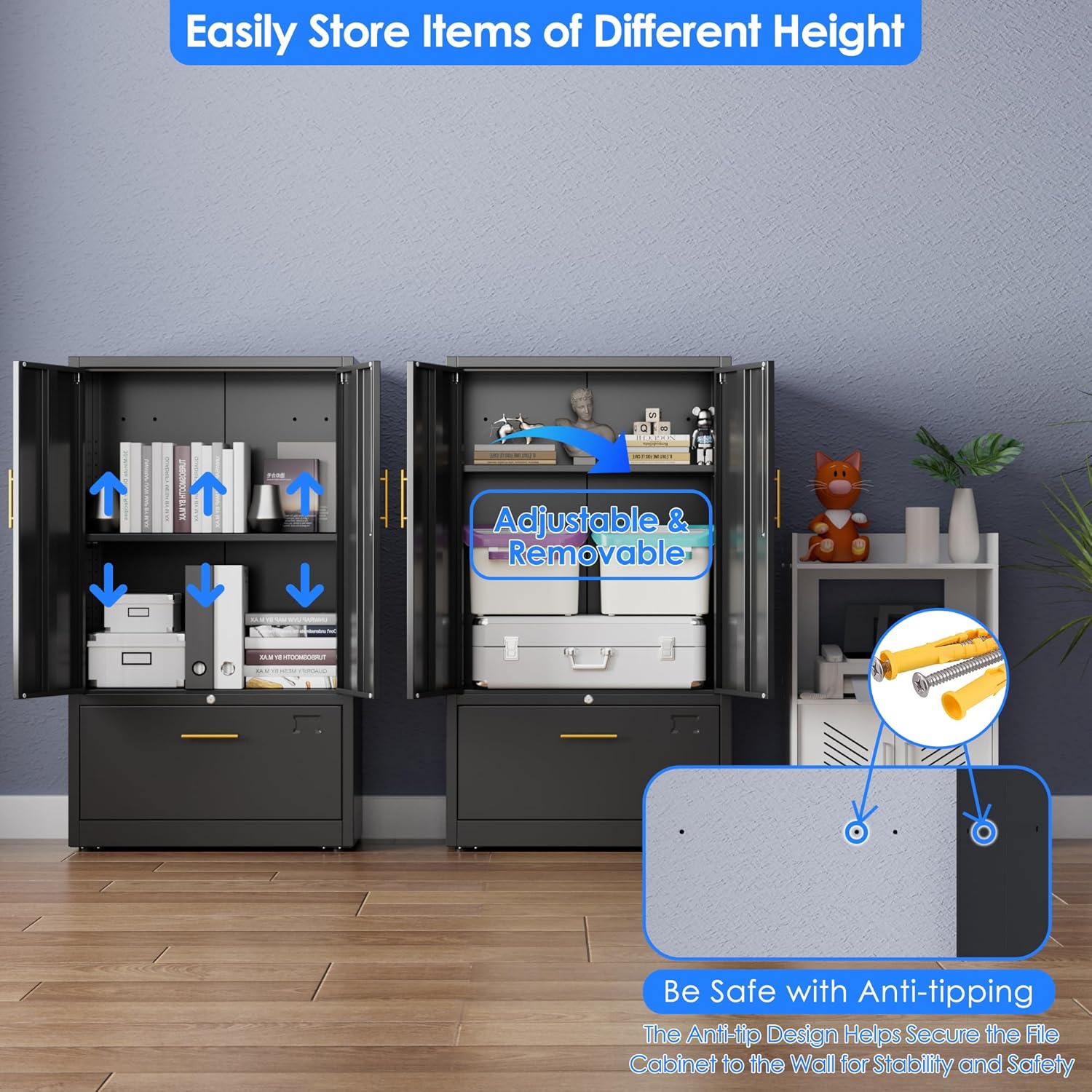 • Novel and Upgraded Design for Versatile Storage: The lateral file cabinet combines a robust metal storage cabinet with adjustable shelf to accommodate items of varying heights, along with one lateral drawers featuring 2 adjustable hanging bars for seamless organization of A4, Letter, or Legal-size folders. This innovative design optimizes space and flexibility for home, office, garage, or school use;